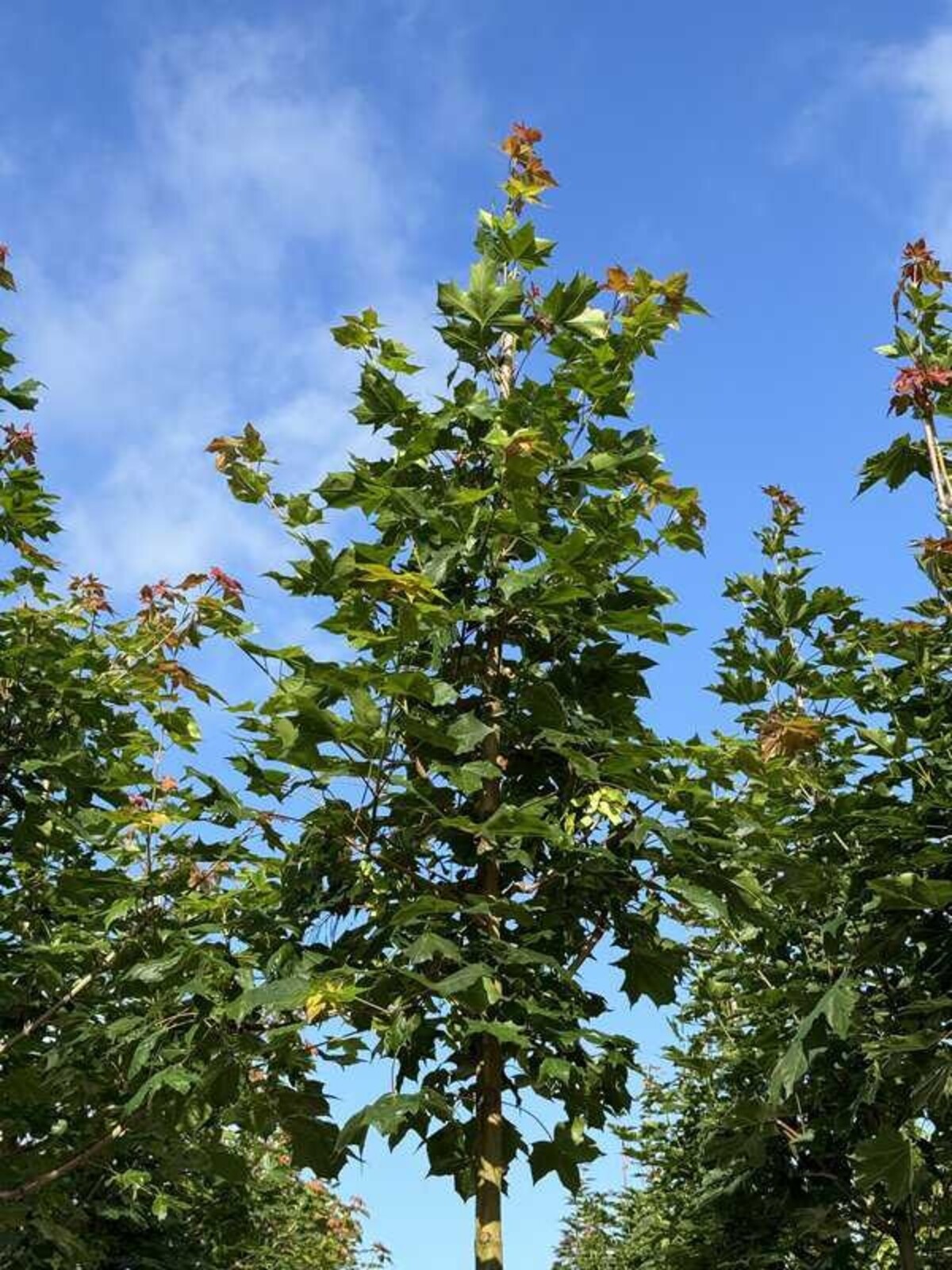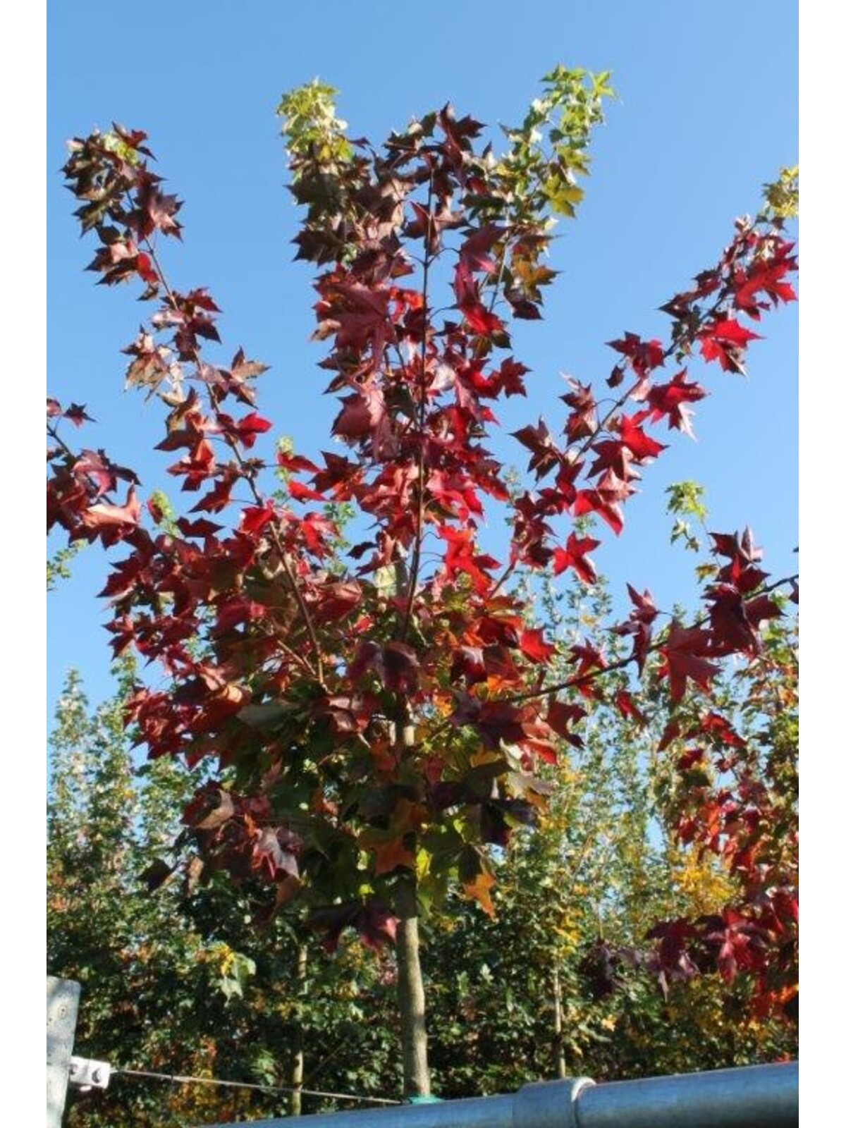 Der 'Norwegian Sunset' zeichnet sich durch seine dichte, rundliche Krone und seine spektakuläre Herbstfärbung aus, die von Orange bis Rot reicht.