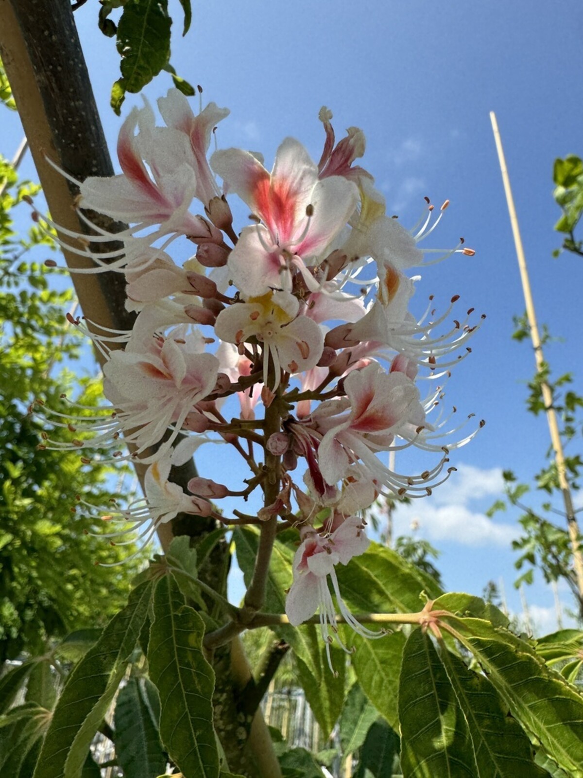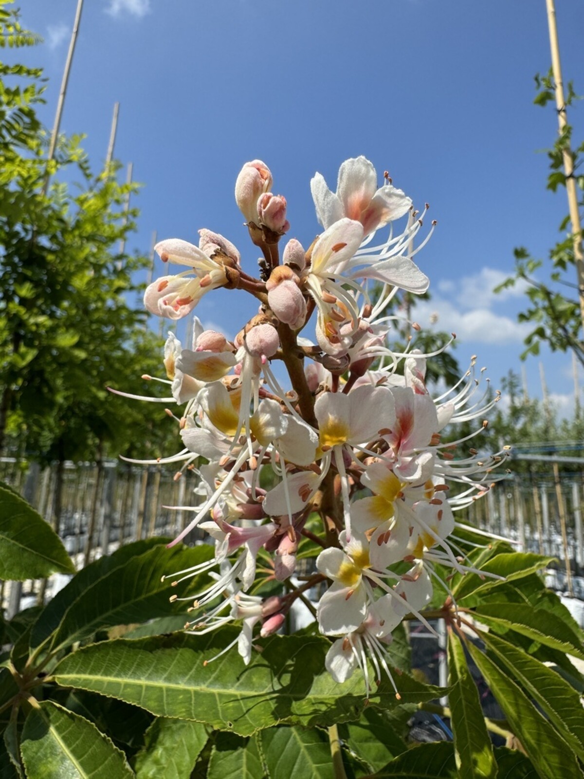Im Sommer schmückt die Indische Rosskastanie Ihren Garten mit großen, aufrechten Blütenrispen in zartem Rosa und Weiß. Diese Blüten ziehen zahlreiche Bienen und Schmetterlinge an, wodurch der Baum nicht nur optisch überzeugt, sondern auch einen Beitrag zur Biodiversität leistet.