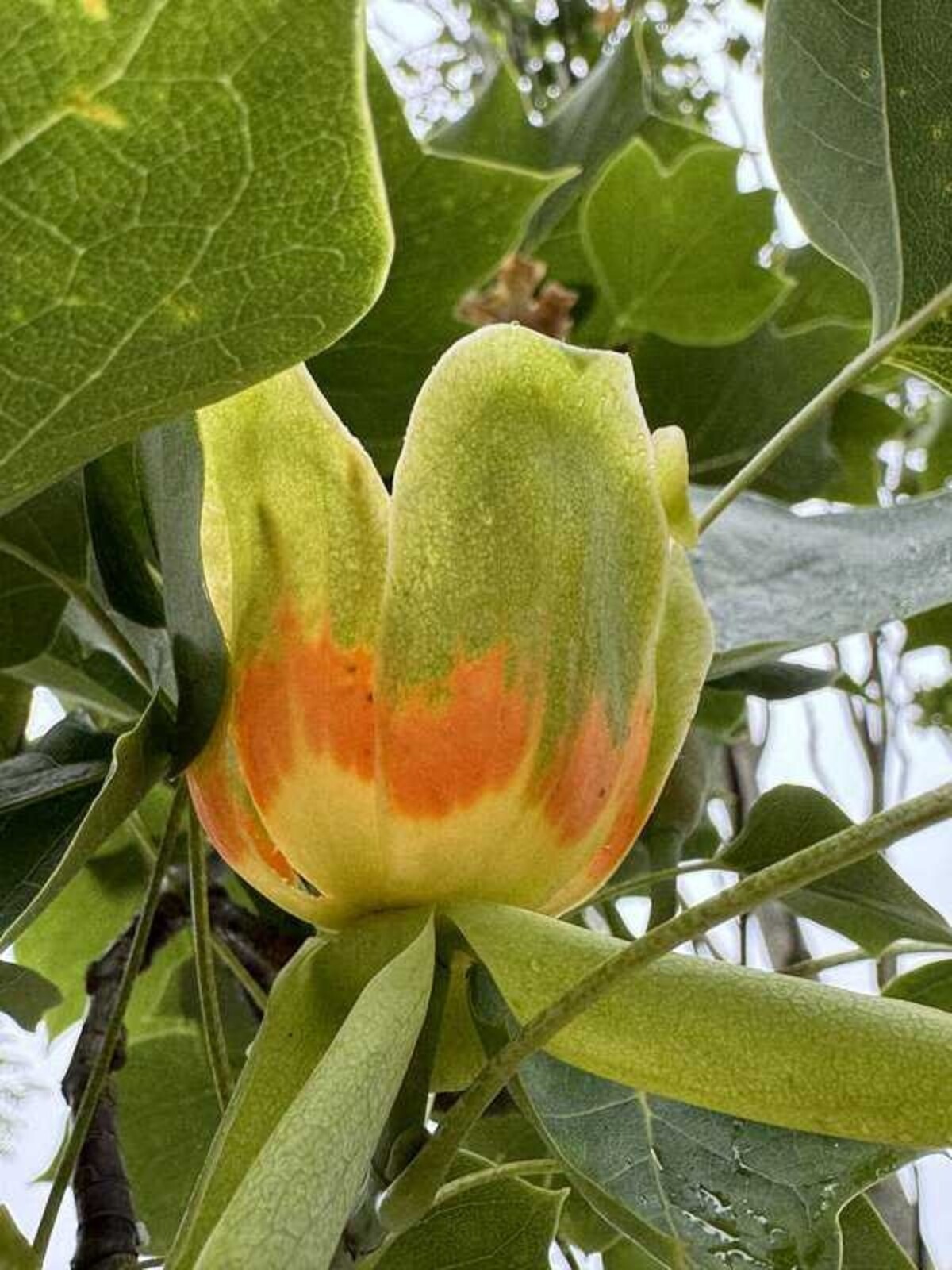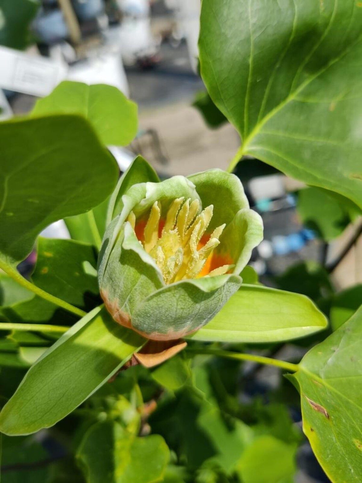 Im späten Frühjahr trägt der Amerikanische Tulpenbaum auffällige, tulpenförmige Blüten in Gelb und Orange, die ein echter Blickfang im Garten sind. -