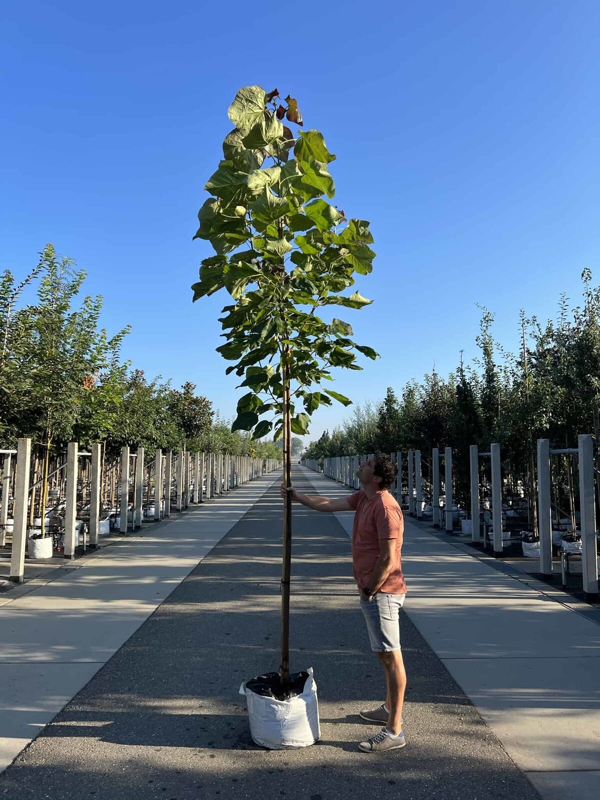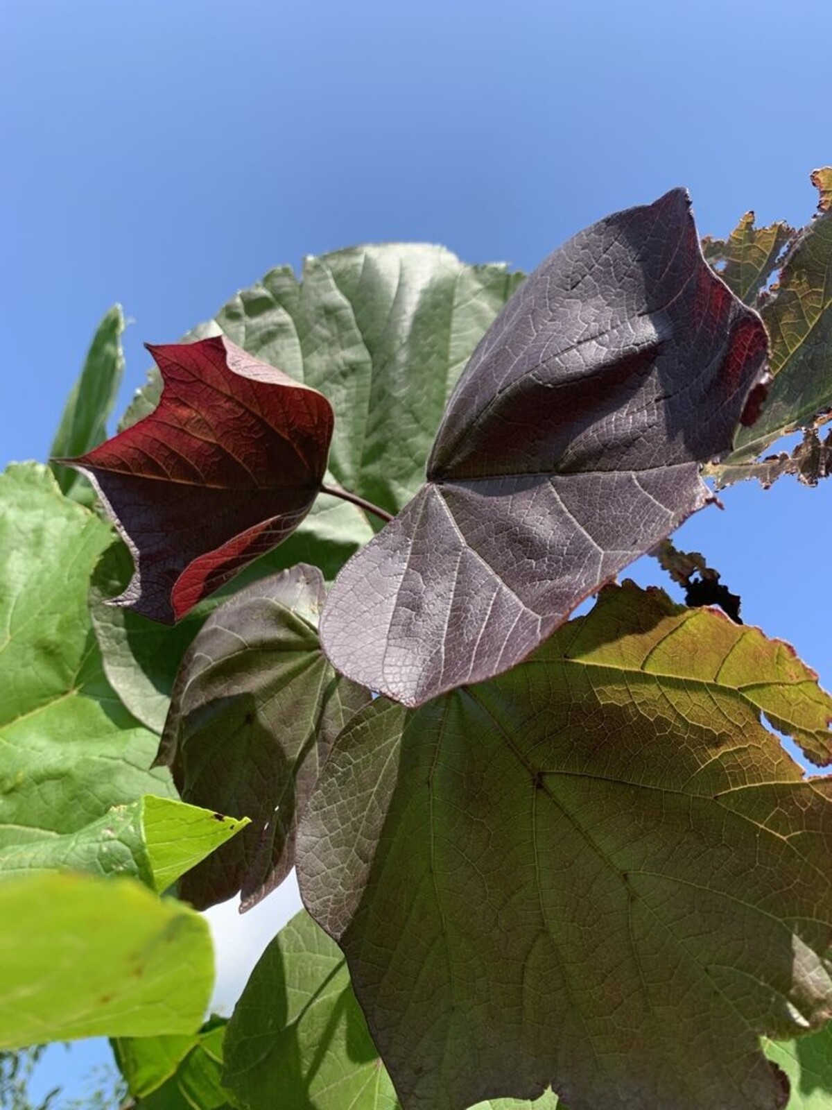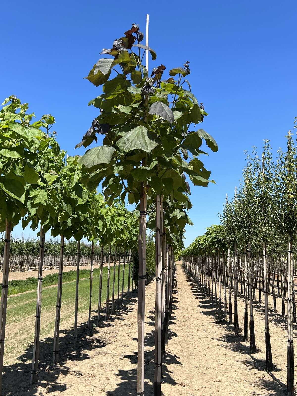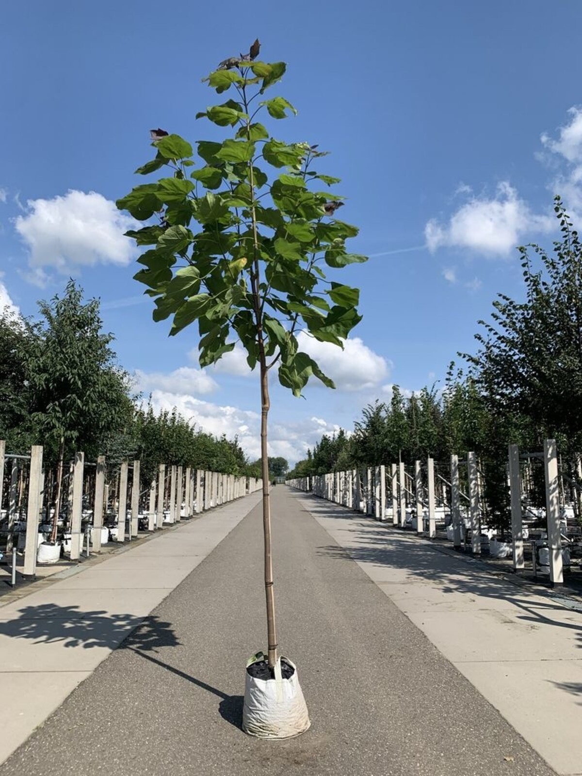 Dieser besondere Baum erreicht eine Höhe von 15 bis 18 Metern und zeichnet sich durch einen dicken, meist kurzen Stamm und eine breit ausladende, unregelmäßige Krone aus. Seine herzförmigen, 10 bis 20 Zentimeter langen Blätter wechseln je nach Jahreszeit zwischen einem intensiven Purpurton und einem lebendigen Grün, was ihn besonders attraktiv macht. Von Juni bis Juli begeistert der Baum mit seinen weißen, glockenförmigen Blüten, die im Inneren purpurfarbene Flecken und gelbe Längsstreifen aufweisen.