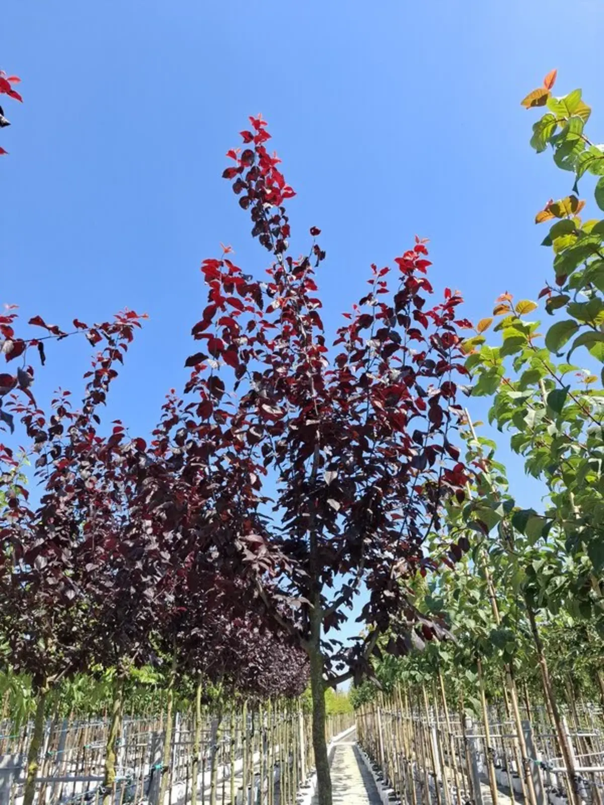 Die Blutpflaume, bekannt für ihre auffällige Laubfarbe, ist eine hervorragende Wahl für Gartenliebhaber, die einen bleibenden Eindruck hinterlassen möchten. Dieser Baum zeichnet sich durch sein tiefrotes bis purpurfarbenes Laub aus, das von Frühling bis Herbst beständig bleibt und dem Garten eine dynamische Farbe verleiht.