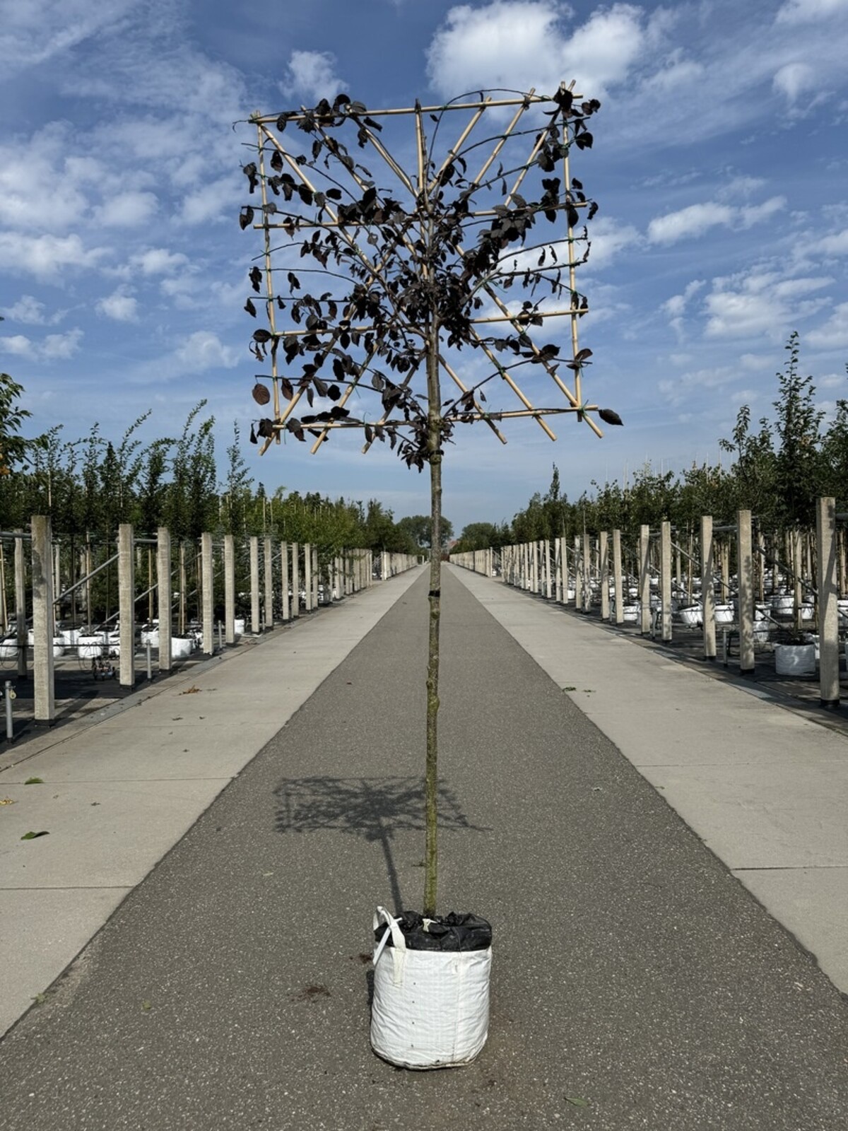 Dank ihres flexiblen Wuchses ist die Blutpflaume ideal für die Spaliererziehung. Mit regelmäßigem Rückschnitt lässt sich der Baum leicht in die gewünschte Form bringen, sodass er als natürlicher Sichtschutz oder zur dekorativen Gestaltung von Wänden und Zäunen verwendet werden kann. Der kompakte Wuchs und das farbenprächtige Laub machen sie zu einem echten Blickfang in kleinen Gärten oder Innenhöfen.