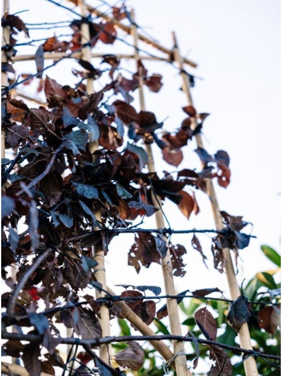 Die Blutpflaume ist relativ pflegeleicht und anpassungsfähig. Sie bevorzugt einen sonnigen Standort, um ihre volle Laub- und Blütenpracht zu entfalten. Der Boden sollte gut durchlässig sein, da sie keine Staunässe verträgt. Als Spalierbaum ist ein jährlicher Rückschnitt sehr zu empfehlen, um die gewünschte Form zu erhalten und sicherzustellen, dass der Baum sich verzweigt, wodurch das Spalier dichter und blickdichter wird. Einmal gut angewachsen, benötigt sie nur minimale Pflege und ist frosthart bis etwa -25°C.