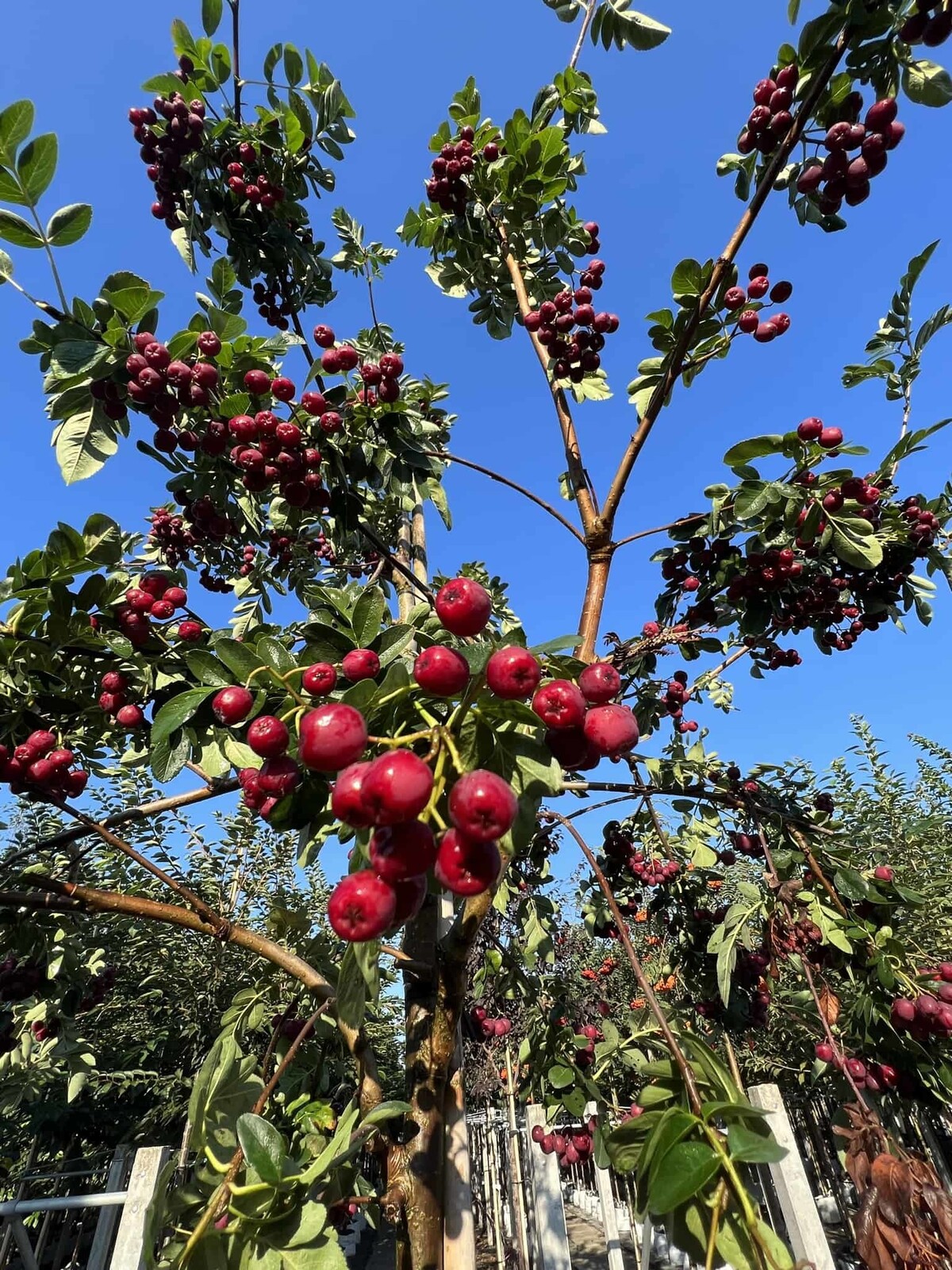 Die Eberesche | Sorbus 'Granatnaja' ist eine beeindruckende Kreuzung zwischen der Sorbus aucuparia und der Crataegus sanguinea, die speziell für die Fruchtproduktion entwickelt wurde. Dieser Baum, der ursprünglich aus Osteuropa stammt, zeigt die bemerkenswerte Winterhärte beider Elternarten. Seine Ähnlichkeit mit einer Eberesche, gekoppelt mit der Blütenpracht eines Weißdorns, macht ihn zu einem einzigartigen Exemplar in jedem Garten.
