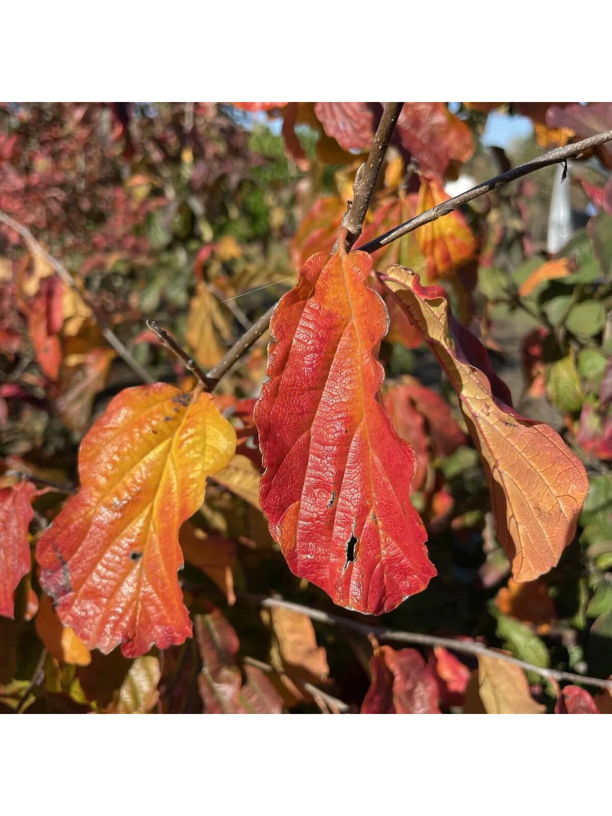 Im Herbst zeigt Parrotia persica mehrstämmig ein farbintensives Feuerwerk aus Gelb, Orange, Scharlachrot bis Purpur – ein Blickfang in jeder Bepflanzung. -