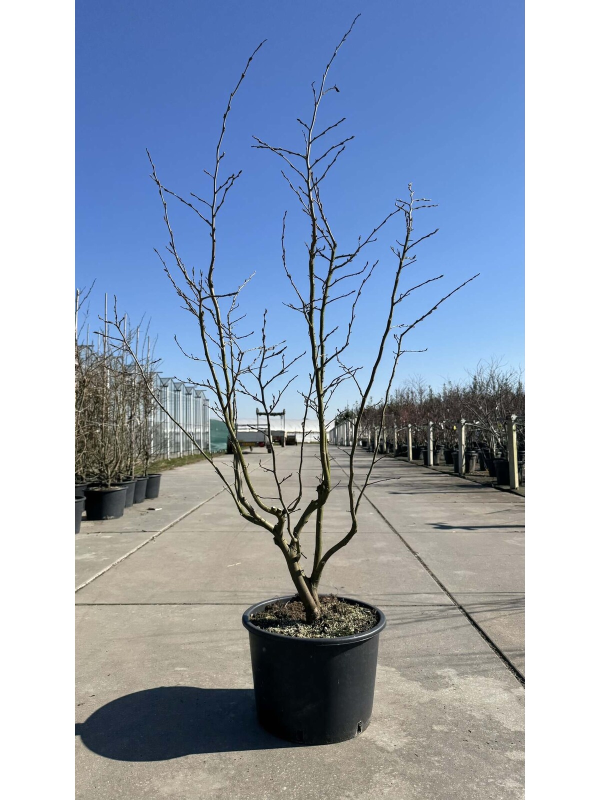 Die mehrstämmige Struktur setzt ohne Laub klare Linien. Knospenanlagen sind bereits vorhanden; der Baum ist winterhart.