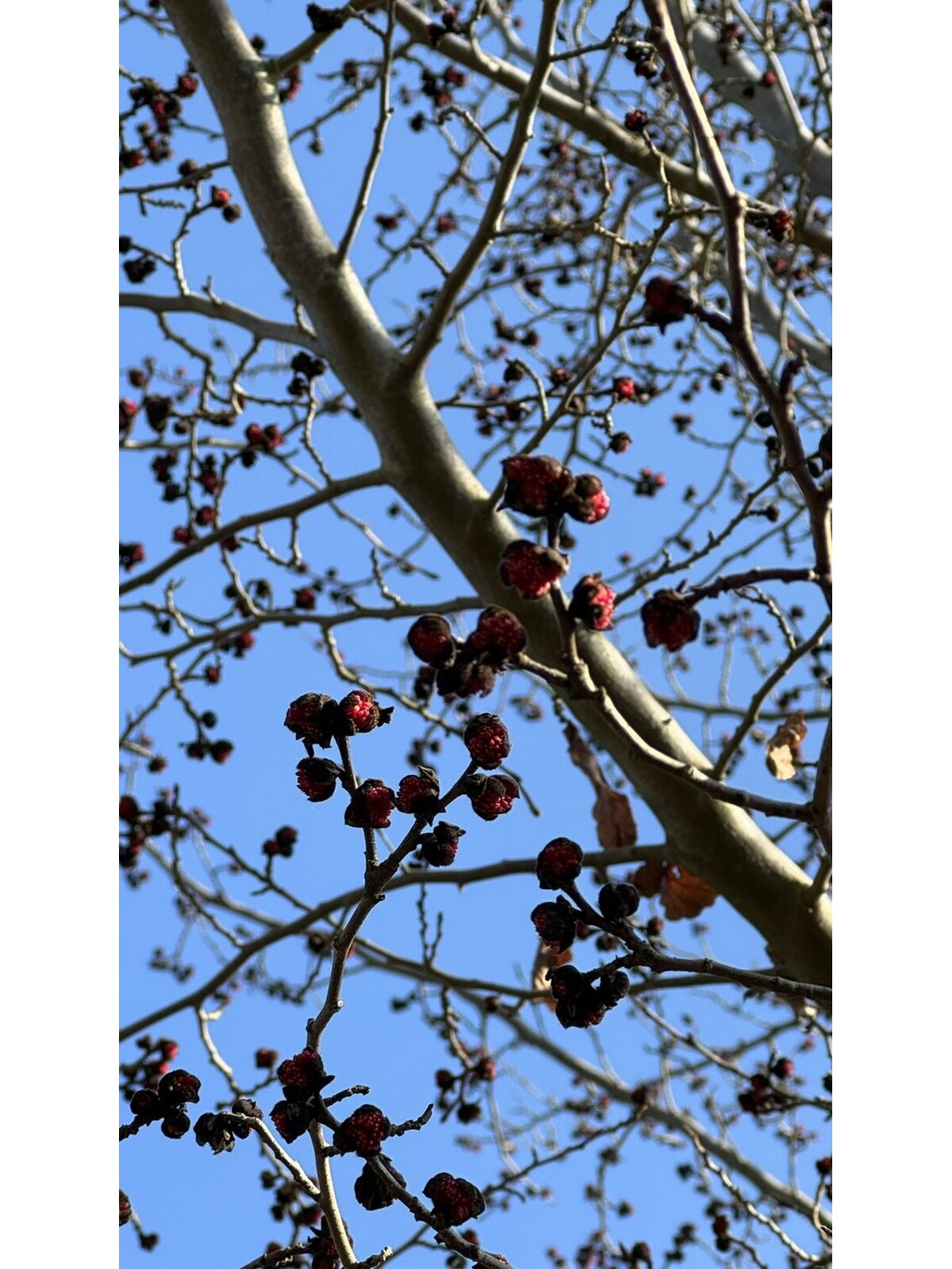 Sehr frühe Blüte (Februar–März) mit kleinen, roten Blüten vor dem Laubaustrieb; kurz darauf frischer grüner Austrieb.