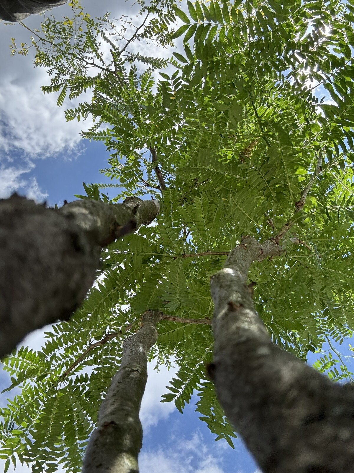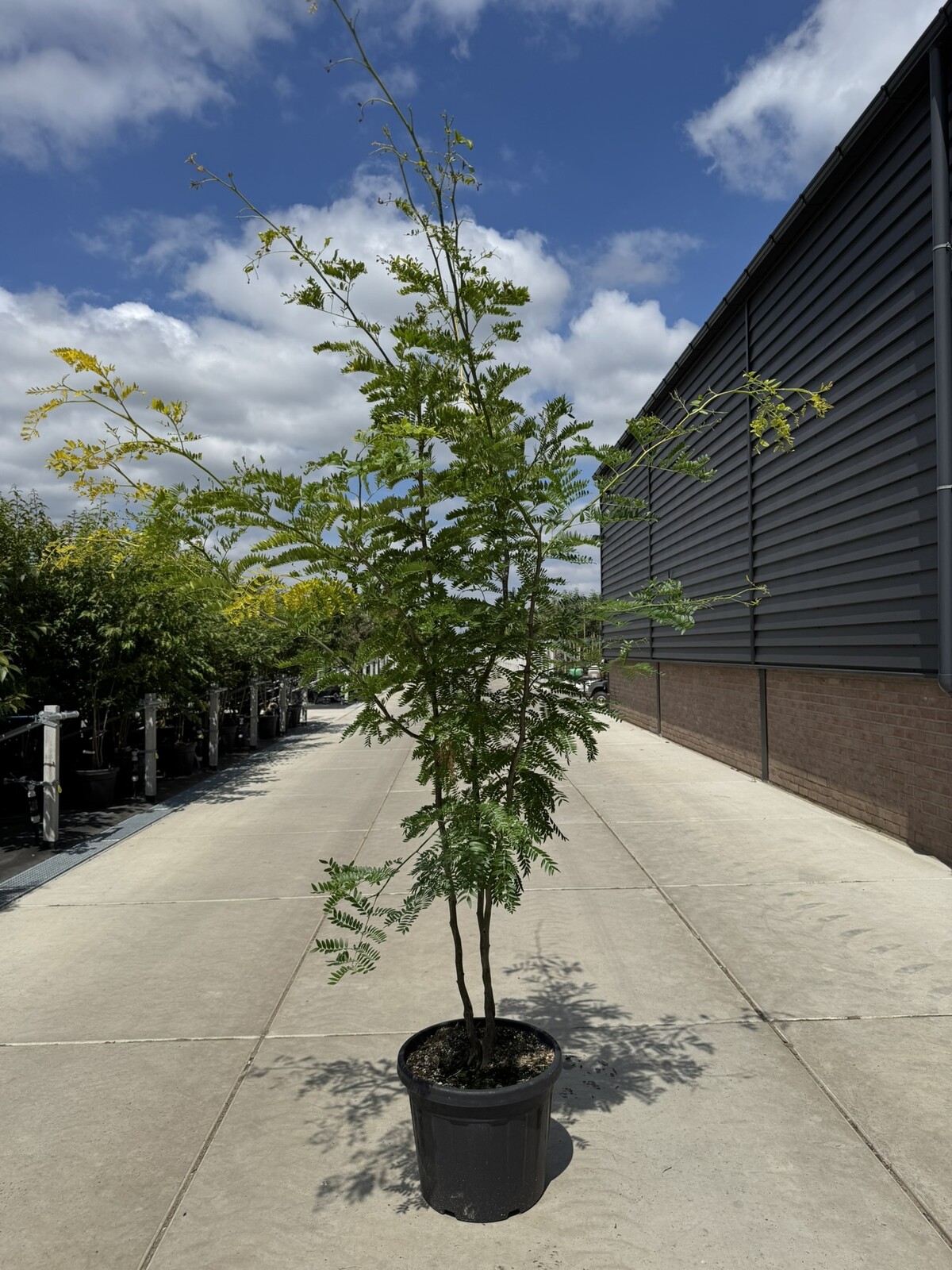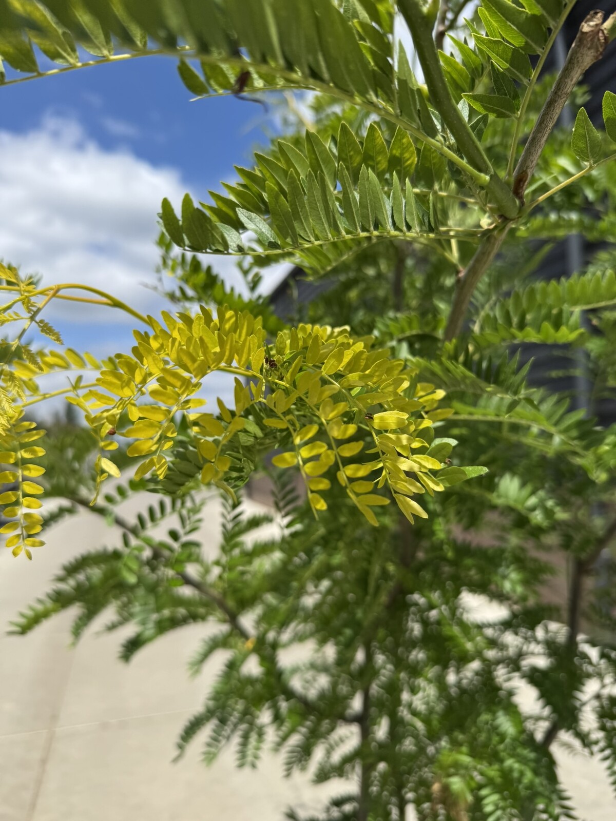 Goldgelber Austrieb und zartgrüne, gefiederte Blätter; die Krone baut ihr luftiges Volumen auf.