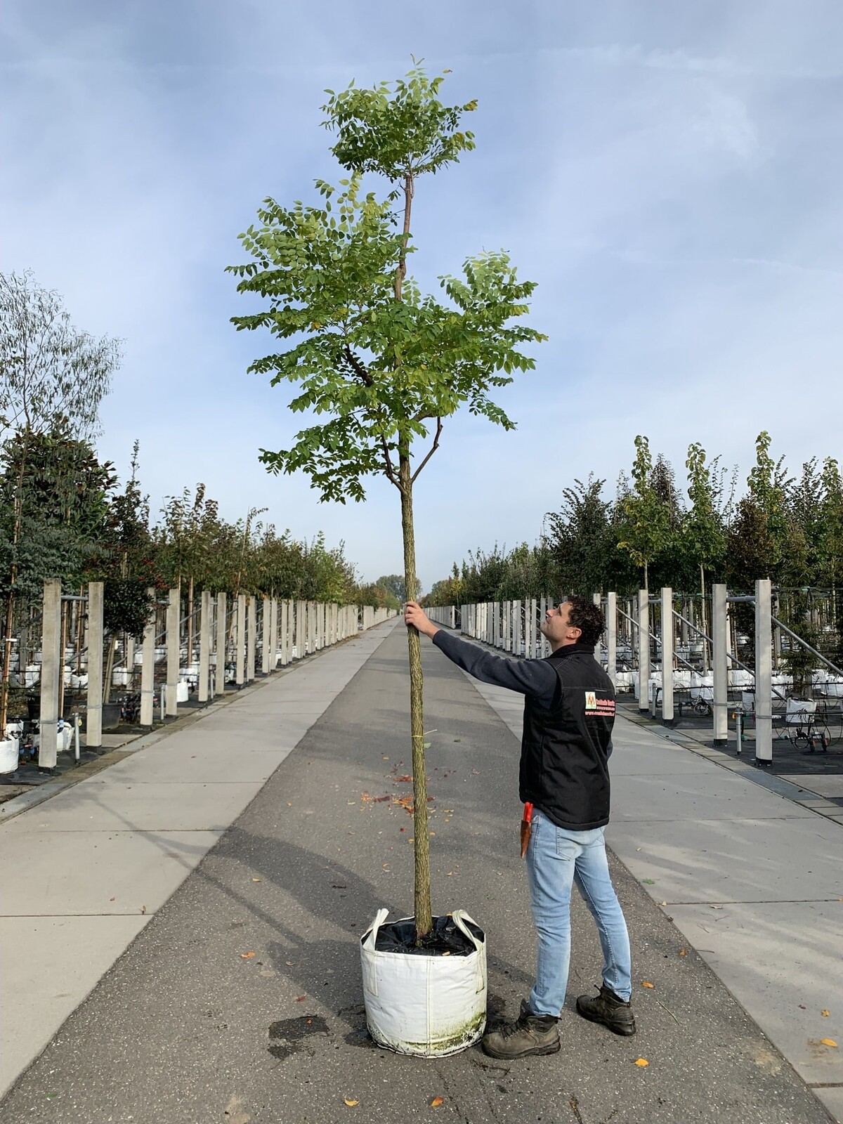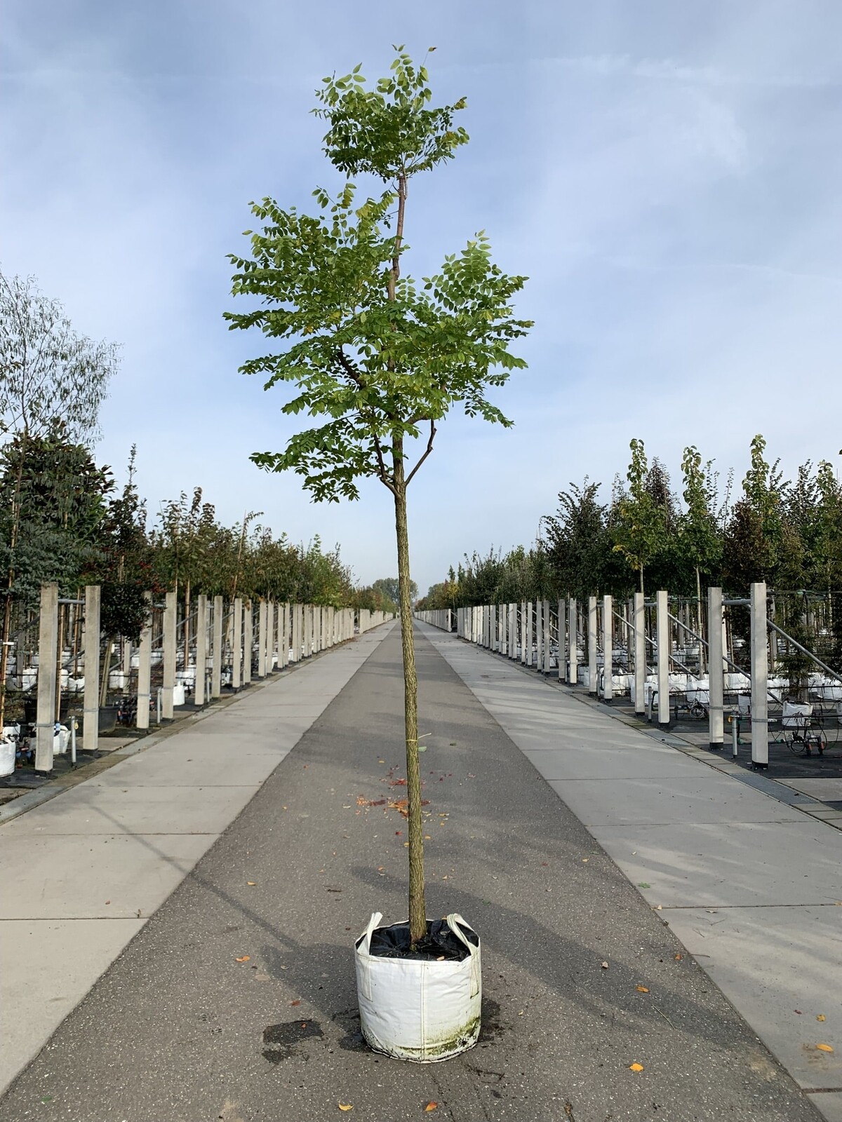 Das Laub des Geweihbaums ist groß und doppelt gefiedert, was ihm eine einzigartige und exotische Ausstrahlung verleiht. Die Blätter entwickeln sich spät im Frühjahr, bilden jedoch ein wunderschönes grünes Blätterdach, das angenehmen Schatten spendet. Im Herbst färbt sich das Laub in warme Gelb- und Brauntöne. Darüber hinaus produziert der Baum auffällige, große Schoten, die dekorativ sind und bis tief in den Winter an den Ästen verbleiben.