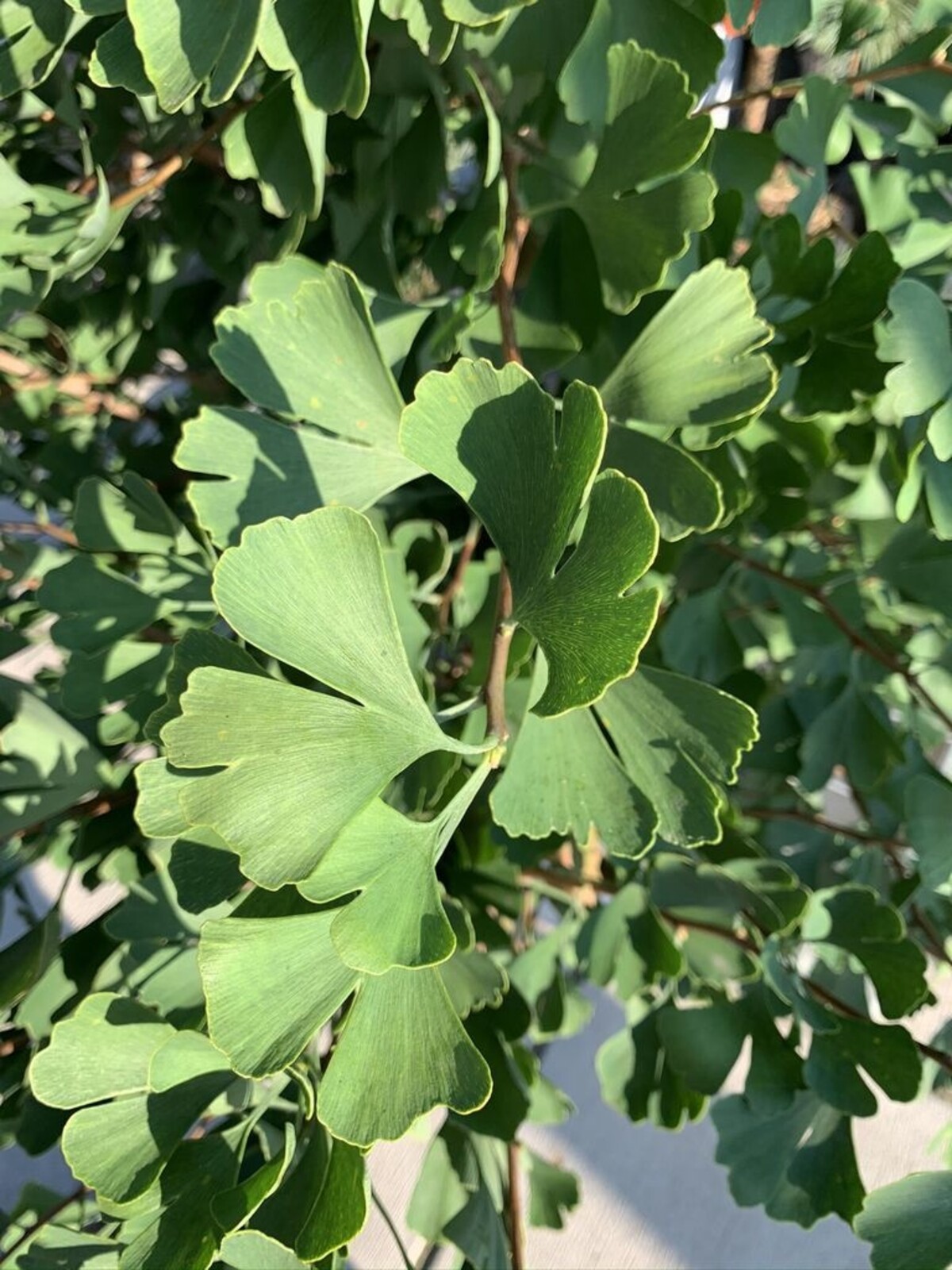Der Ginkgo 'Blagon' zeigt eine feine Textur in seinen Zweigen, die in hellem Braun erscheinen. Mit der Zeit entwickelt die Rinde eine tief gefurchte, graubraune Textur, die einen interessanten Kontrast zum Laubwerk bildet.