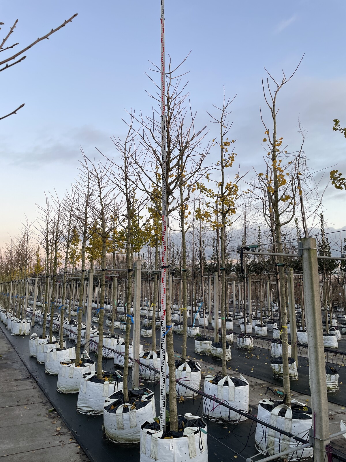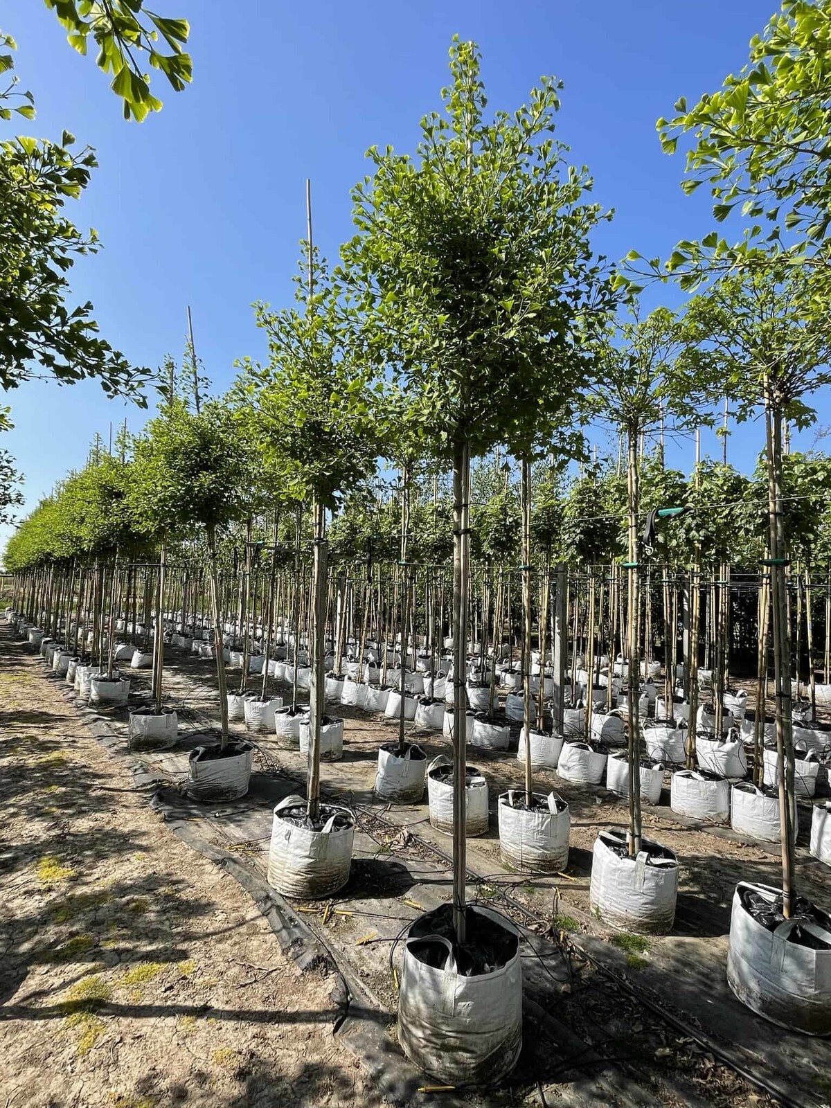 Es wird dringend empfohlen, den Baum nach dem Pflanzen zwischen zwei Baumstangen zu fixieren, um Stabilität zu gewährleisten und zu verhindern, dass der Baum durch Windbewegungen wackelt, wodurch empfindliche frische Wurzeln abreißen könnten.