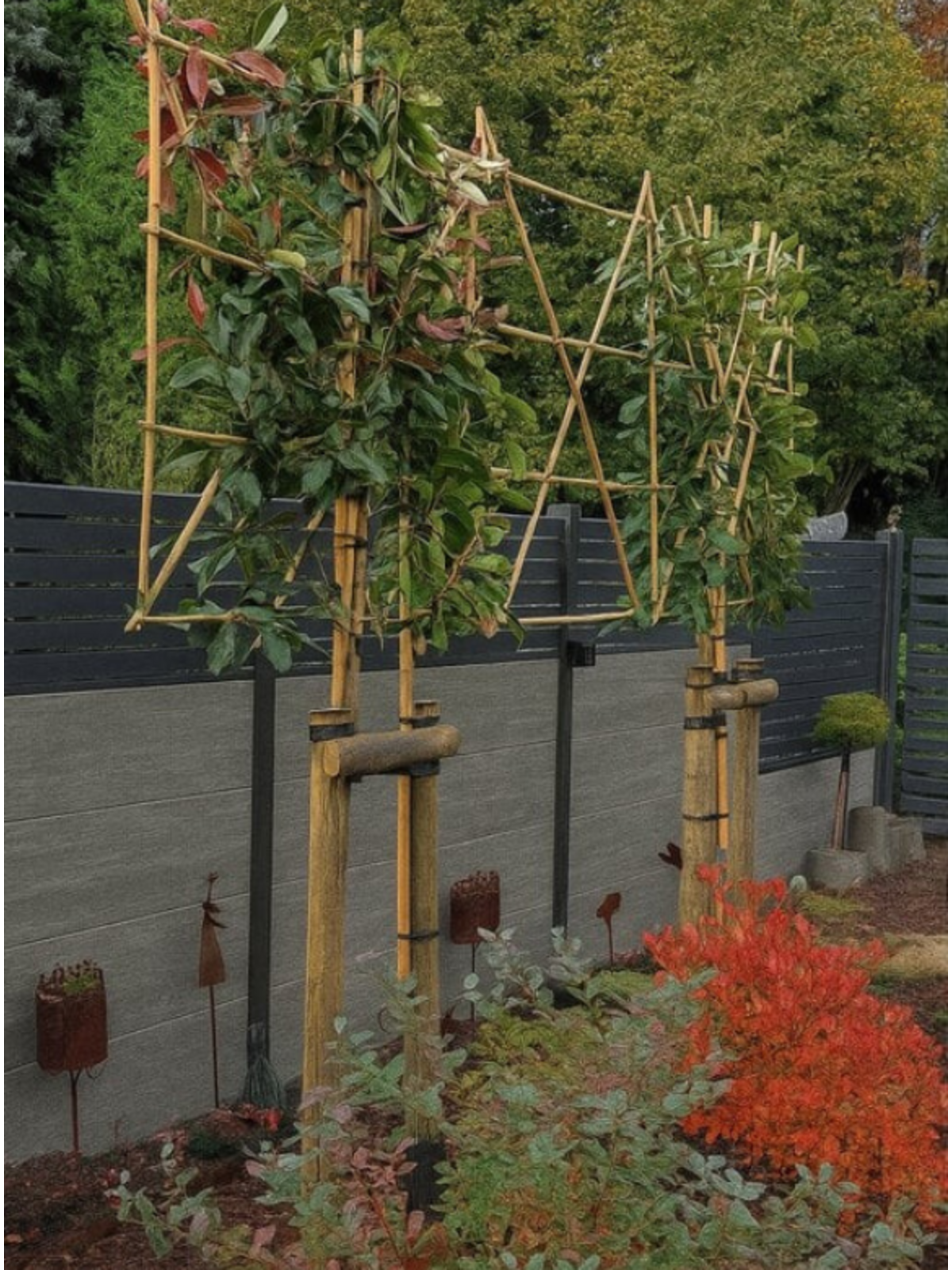 Das Verbindungsset enthält Bambusstöcke und Bindedraht, mit denen Sie die Seitentriebe der Bäume so lenken können, dass sie zusammenwachsen und eine lückenlose grüne Wand entsteht.