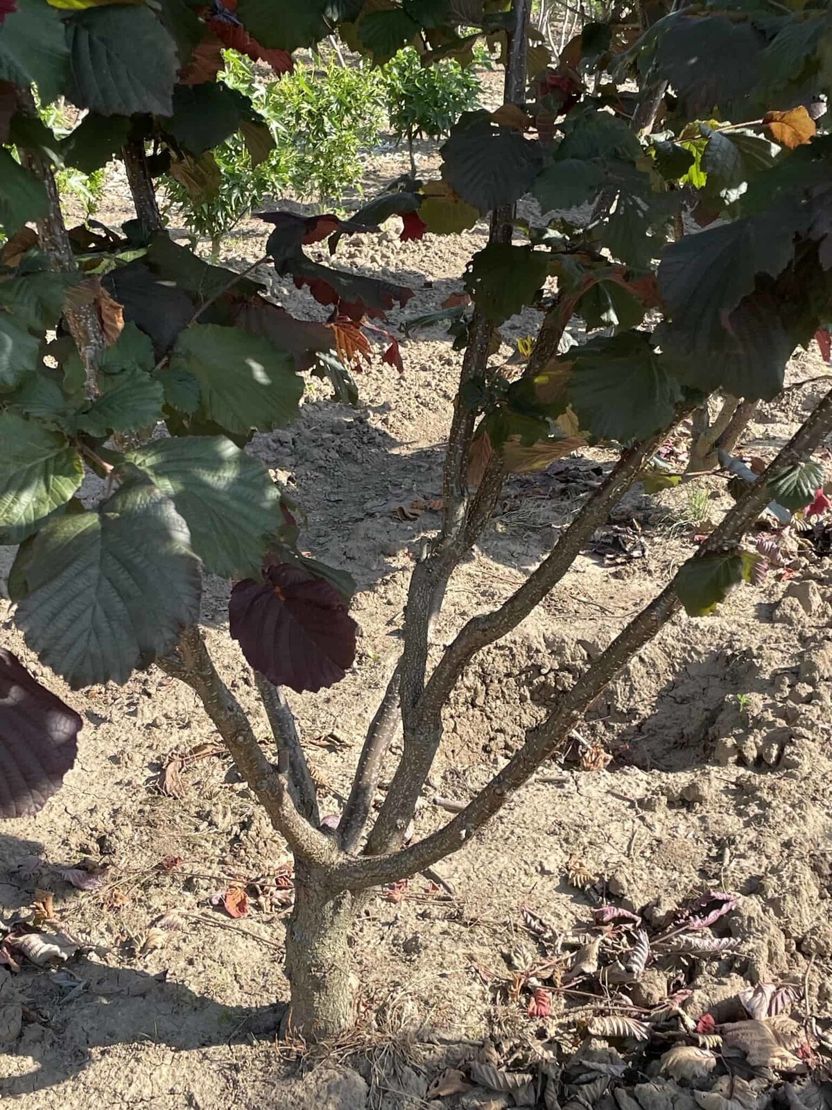 Reife Haselnüsse und je nach Standort bronzefarbene bis rötliche Laubtöne; anschließend zeigt sich die klare Winterstruktur der Mehrstamm-Form.