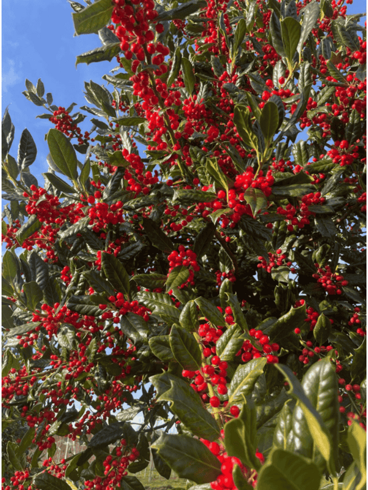 Der Ilex Baum bleibt mit seinem dichten, glänzend grünen Laub attraktiv und trägt im Winter leuchtend rote Beeren, die Vögel anlocken.