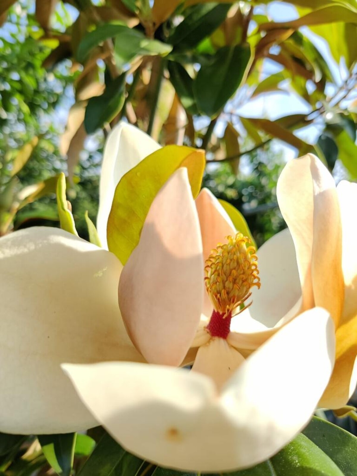 Von Juni bis September kann die Magnolia grandiflora große, cremeweiße und duftende Blüten zeigen. In kühleren Lagen fällt die Blüte oft weniger üppig aus. -
