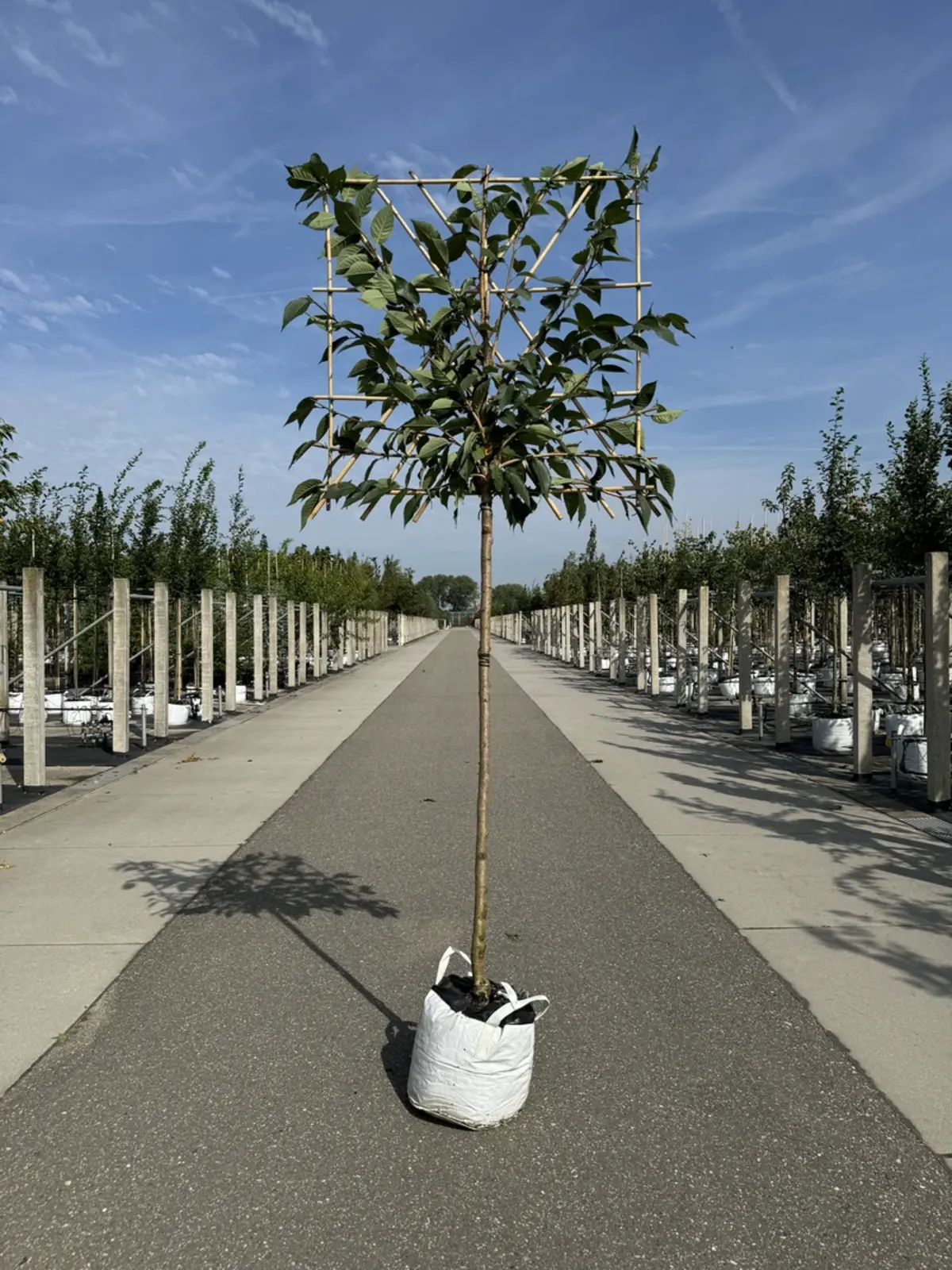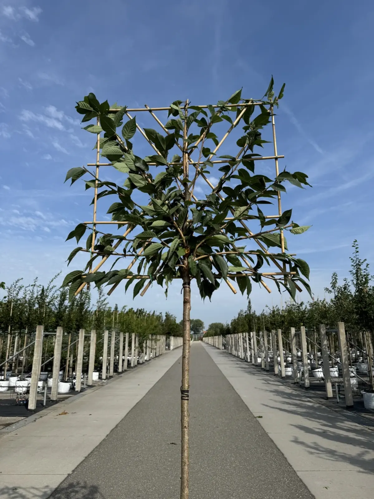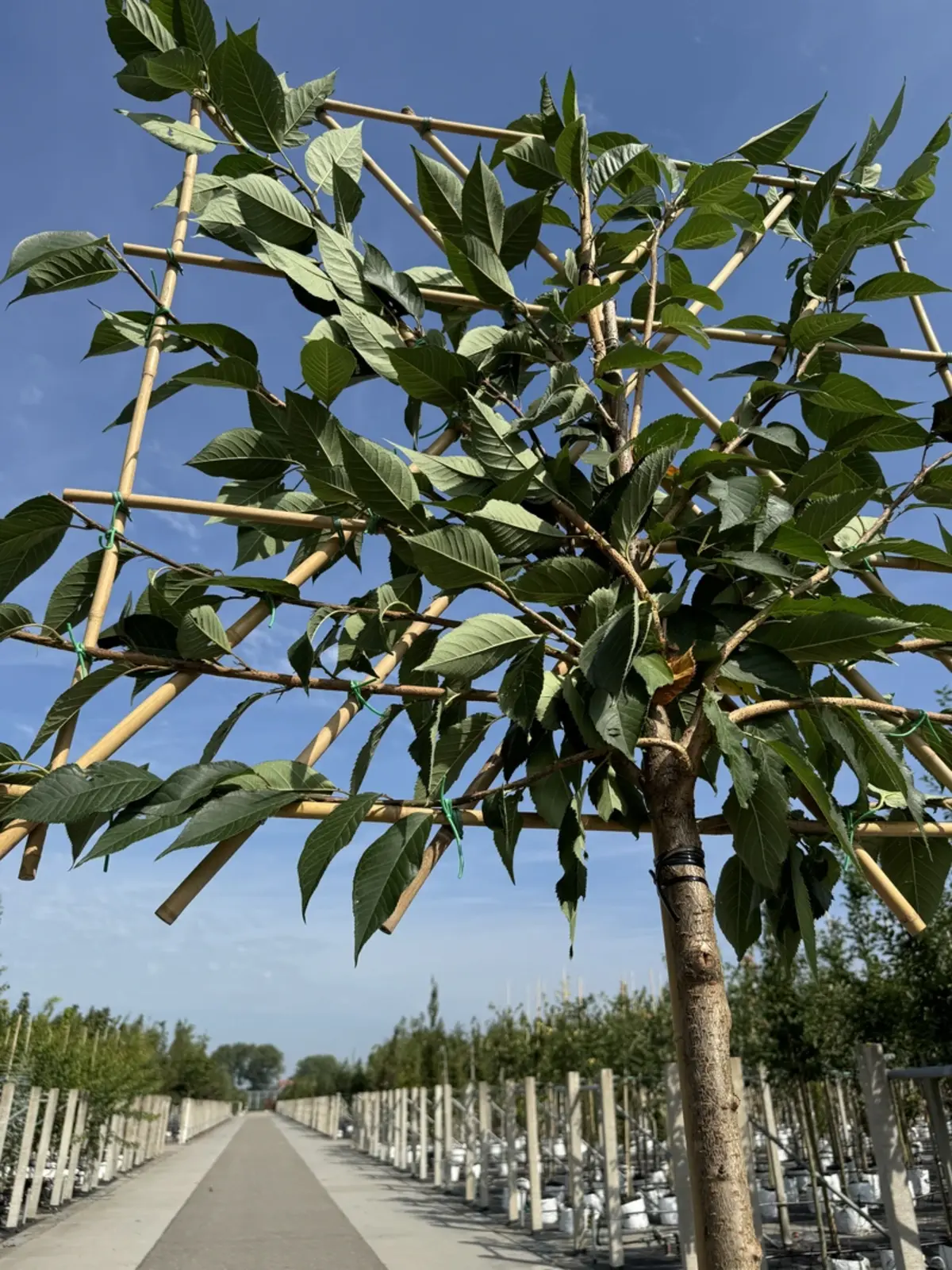 Als Spalierbaum benötigt diese Zierkirsche wenig horizontalen Platz. Achten Sie jedoch darauf, dass sie genügend Platz hat, um vertikal zu wachsen. Ein Abstand von 30–50 cm zu Wänden oder Zäunen ist empfehlenswert.