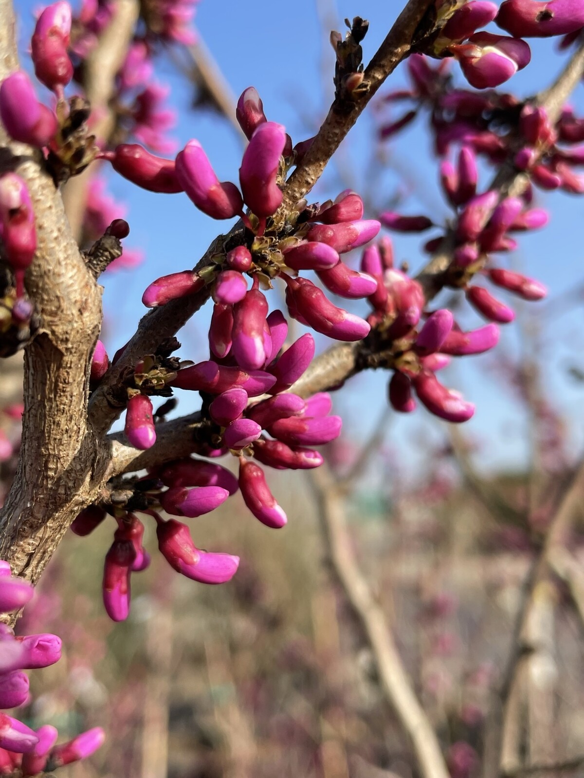 Ab April üppige, kräftig rosa Blüten direkt am Holz; kurz darauf frischer Laubaustrieb mit herzförmigen Blättern.