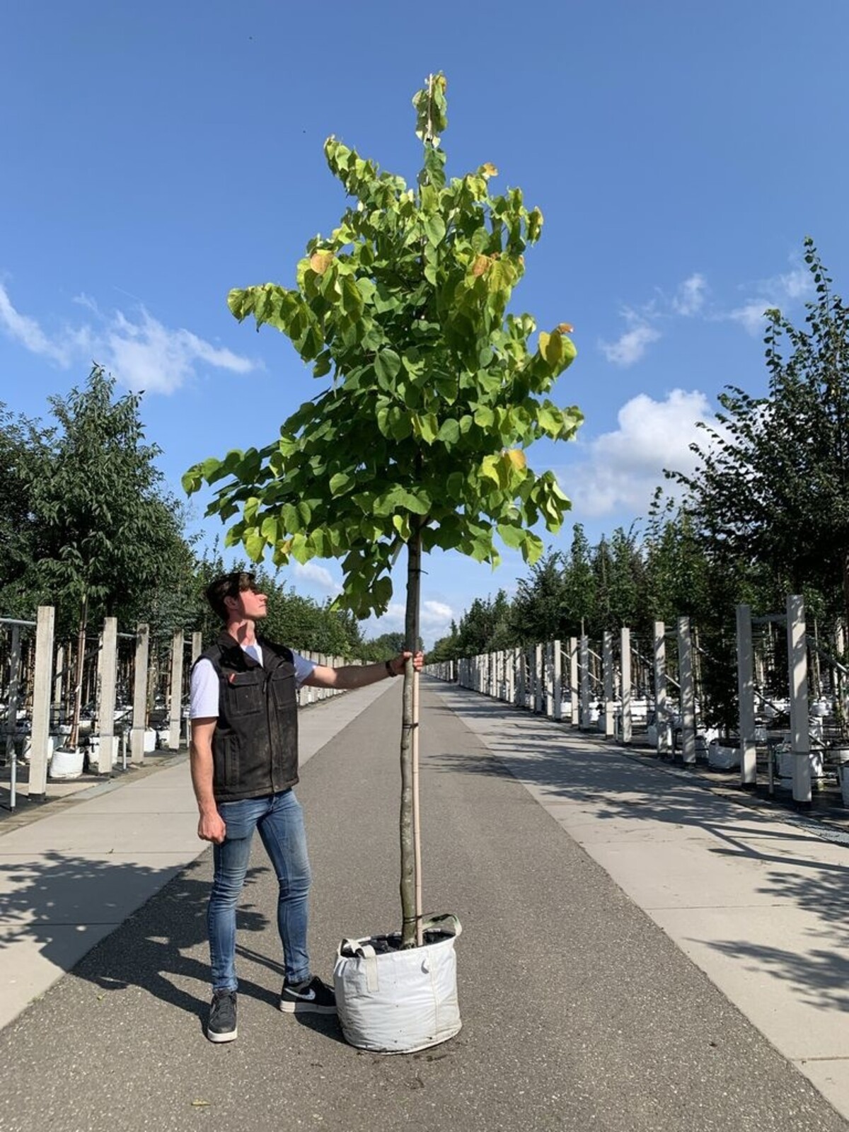 Dieser Judasbaum zeichnet sich durch seine leuchtend gelben Blätter aus, die im Frühling und Sommer einen lebhaften Farbtupfer setzen. Die kontrastierenden, pinkfarbenen Blüten verstärken die Attraktivität dieses Baumes.
