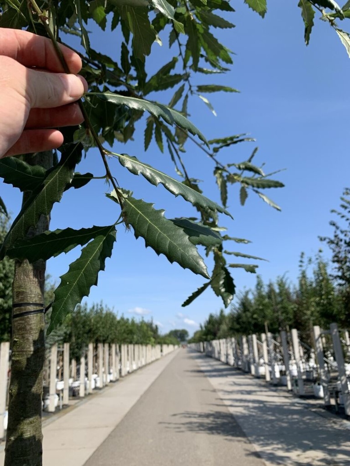 Die Kastanienblättrige Eiche 'Green Spire' ist besonders pflegeleicht. Regelmäßiges Beschneiden ist nicht erforderlich, aber tote oder beschädigte Äste können im Winter entfernt werden. Sorgen Sie in den ersten Jahren nach der Pflanzung für ausreichend Wasser, damit der Baum gut wurzelt. Eine leichte Düngung im Frühjahr unterstützt gesundes Wachstum und eine kräftige Entwicklung.