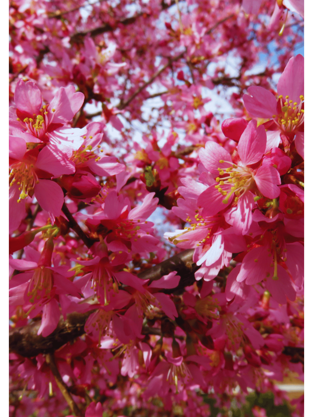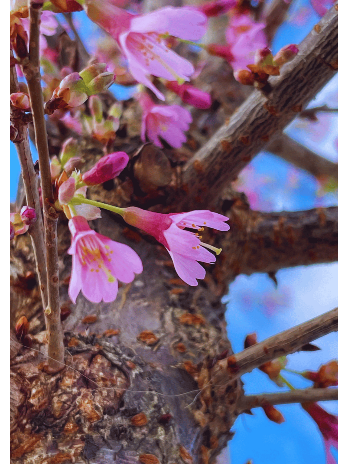 Im Winter ist die feine, leicht überhängende Verzweigung der 'Okame' gut sichtbar. Schon jetzt sind die Blütenknospen deutlich erkennbar und versprechen den Frühling.
