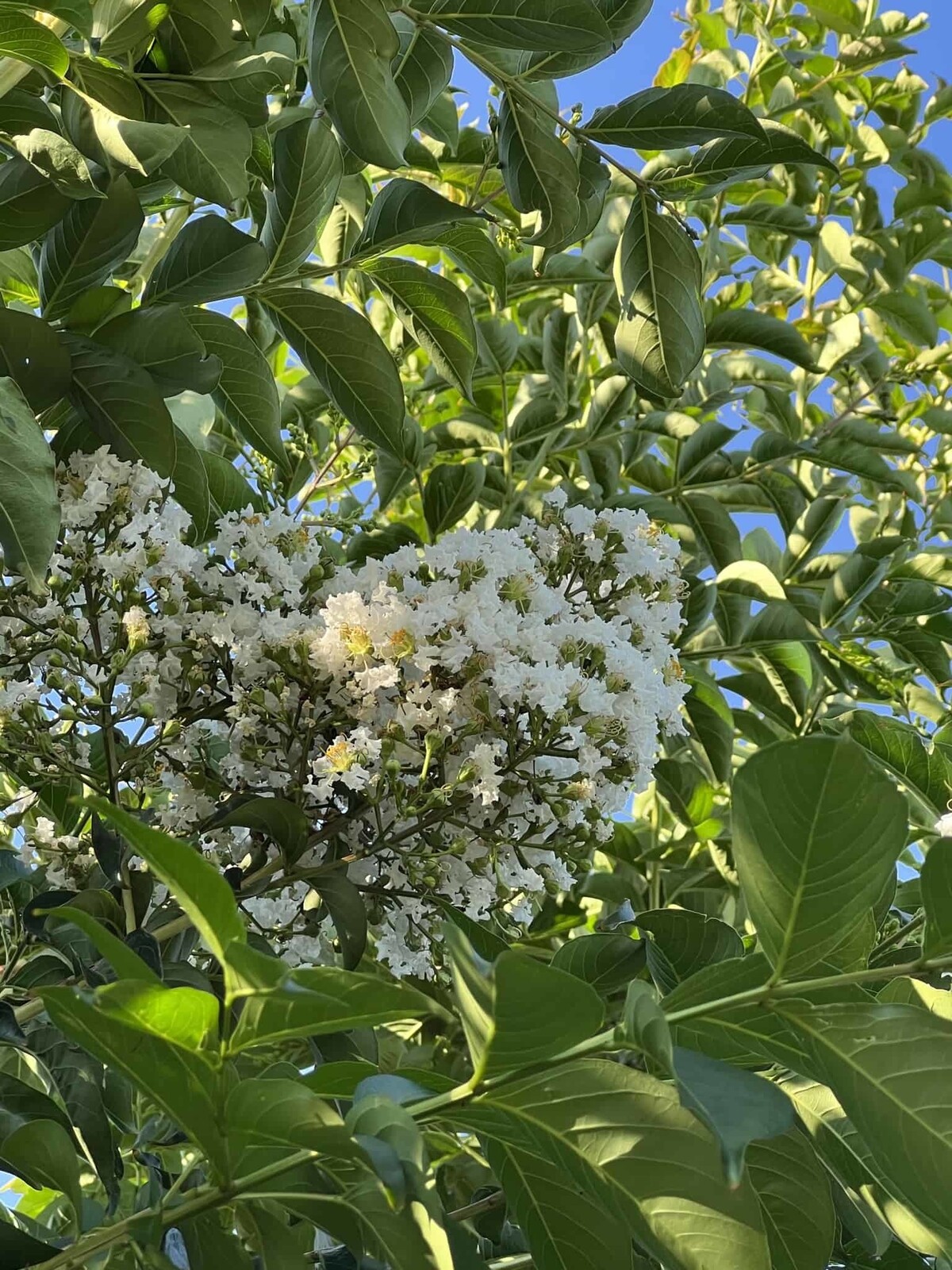Der Sommer ist die Blütezeit der Kräuselmyrte. Die weißen, duftenden Blüten bilden einen spektakulären Kontrast zum dunkelgrünen Laub.