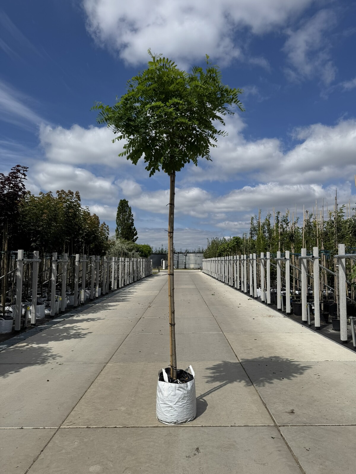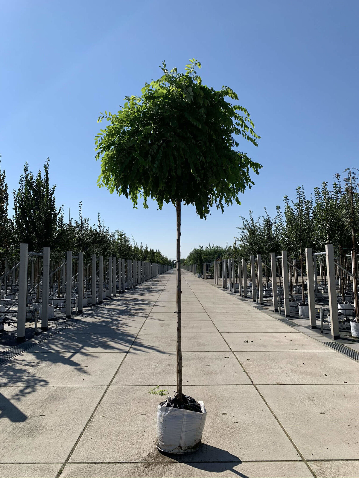 Die Kugelakazie Umbraculifera stammt ursprünglich aus Nordamerika und wurde im 17. Jahrhundert nach Europa gebracht. Sie wurde wegen ihrer dekorativen Form und ihrer Anpassungsfähigkeit an verschiedene Bodenarten geschätzt. Im Laufe der Jahre hat sie sich in vielen europäischen Gärten und Parks etabliert.Kugelrobinie als Hochstamm