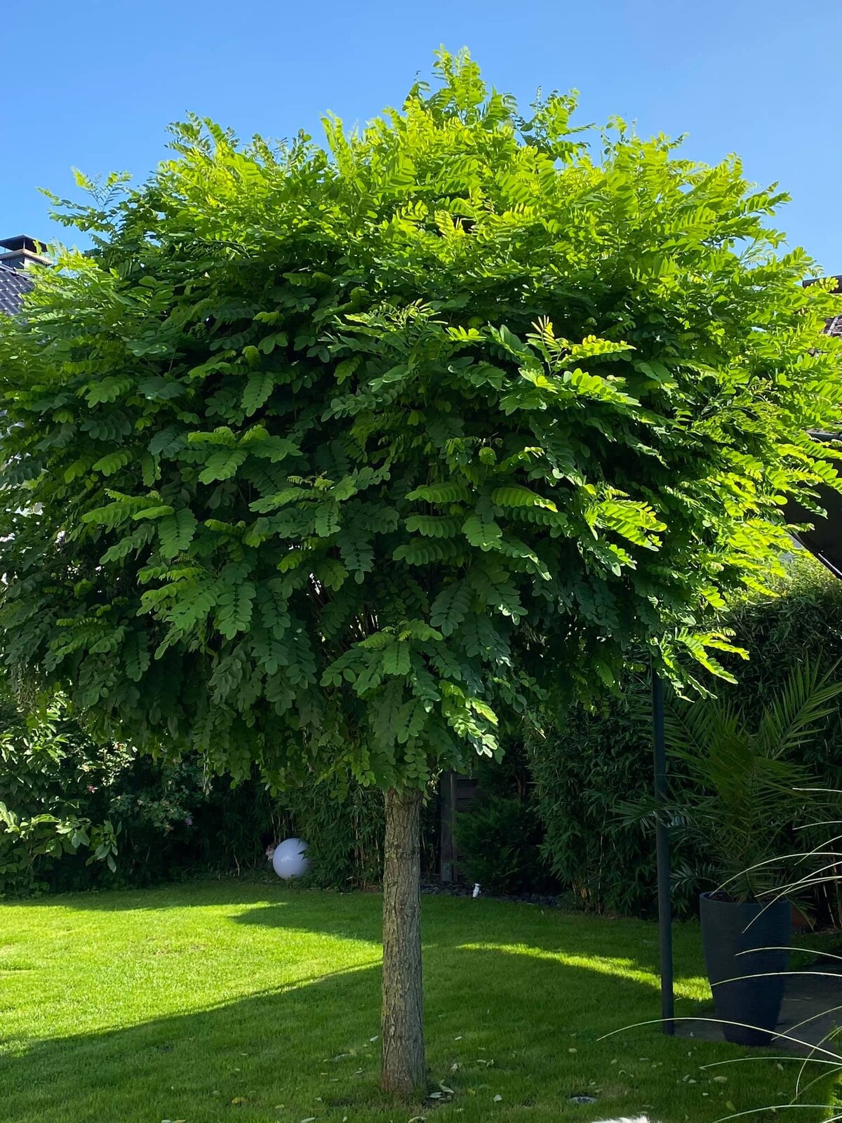 Was ist eine Kugelakazie?Die Kugelakazie, auch Kugelrobinie genannt, ist eine Zierform der Robinie mit einer kompakten, kugelförmigen Krone. Sie ist bekannt für ihre gefiederten Blätter und duftenden weißen Blüten, die im Frühjahr erscheinen. Sie wird oft in Gärten und Parks wegen ihrer dekorativen Form und ihrer Anpassungsfähigkeit an verschiedene Umgebungen gepflanzt.
