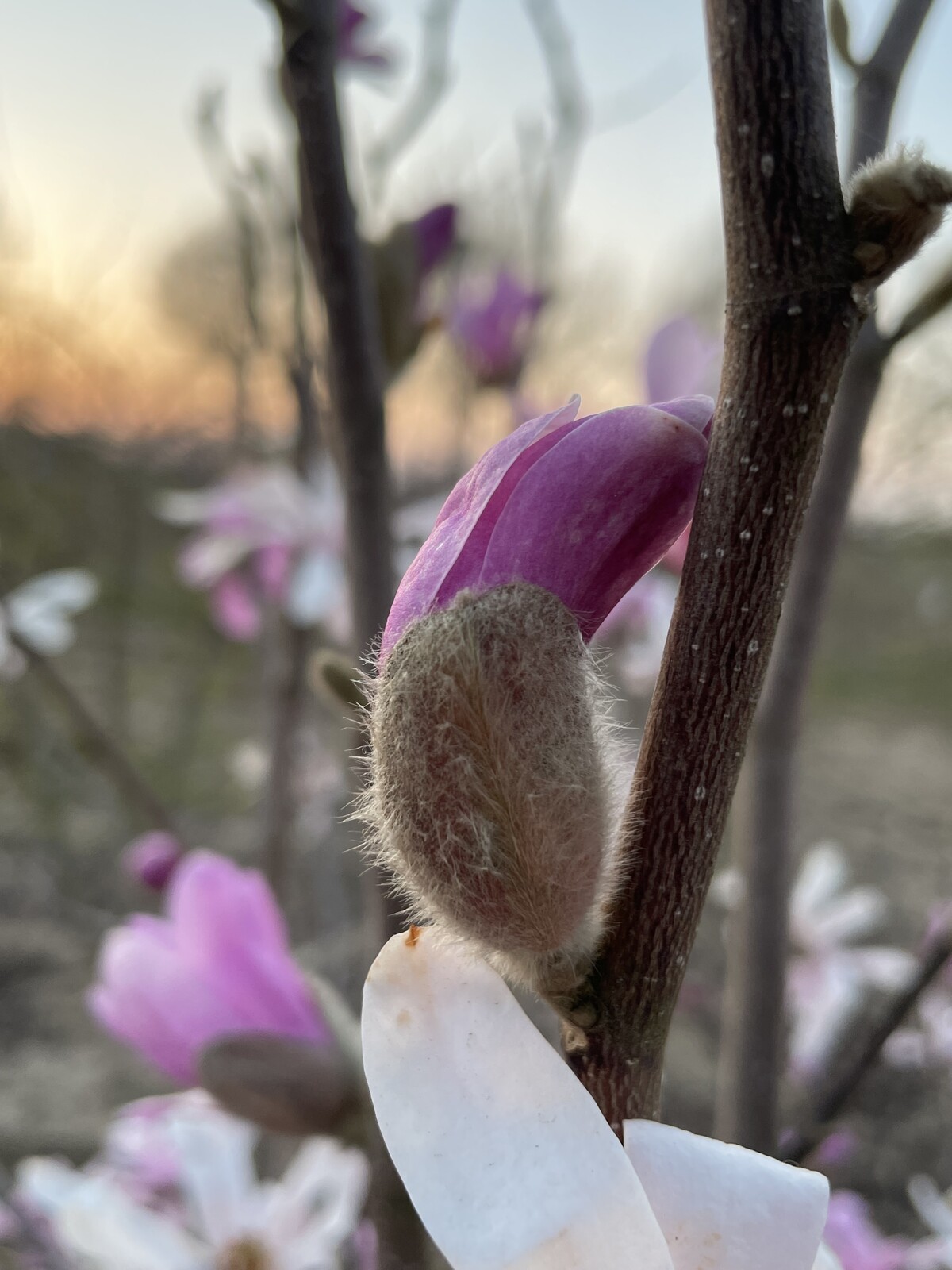 Skulpturale Mehrstamm-Silhouette mit flaumigen Knospen; dezente Rindenwirkung im laubfreien Garten.