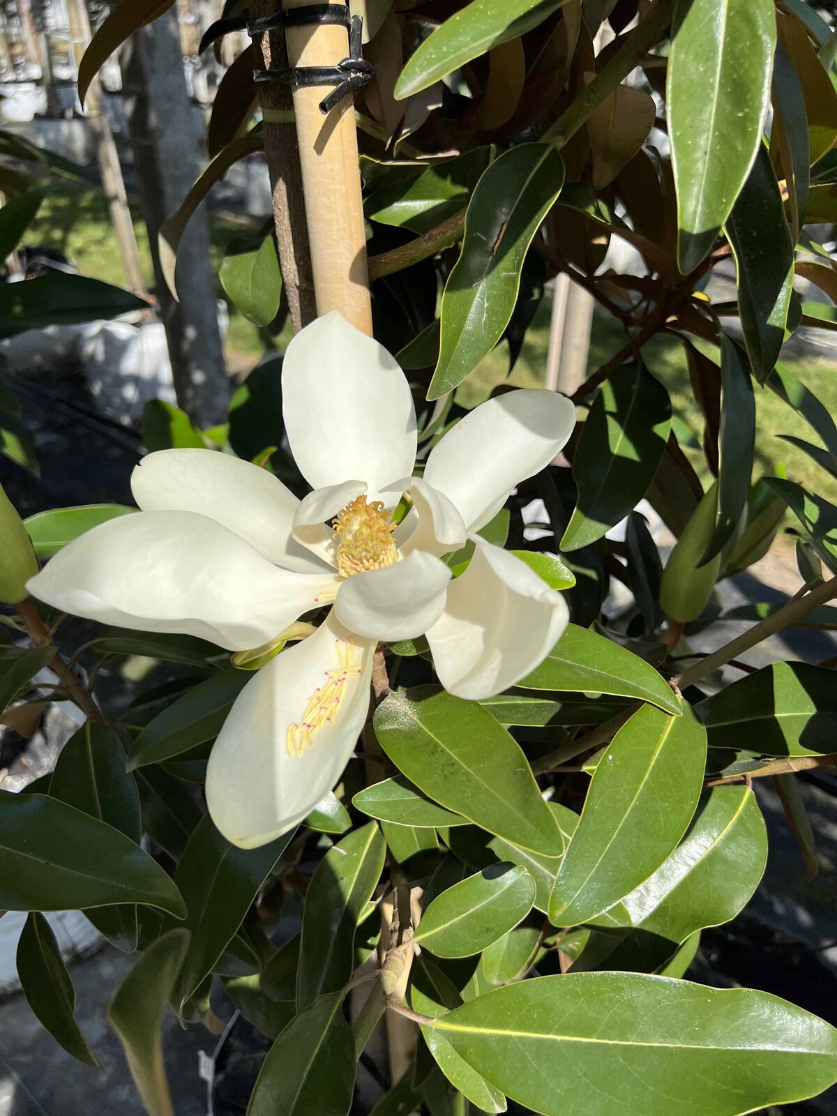 Halten Sie einen Abstand von mindestens 2 bis 3 Metern zu anderen Pflanzen ein, damit die Magnolie ihre schmale, aber hohe Wuchsform optimal entwickeln kann.