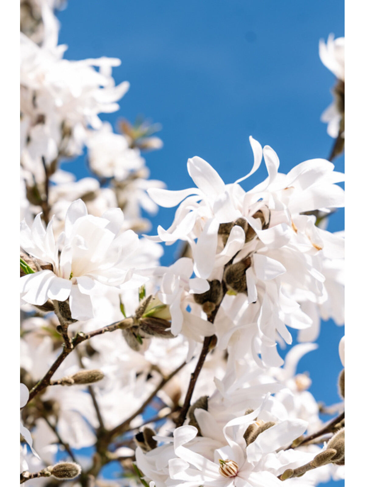 Mit ihrer spektakulären Blüte im April und Mai gehört die Magnolia loebneri 'Merrill' zu den ersten Bäumen, die den Frühling einläuten. Die sternförmigen Blüten sind reinweiß und verströmen einen zarten, süßen Duft. Besonders beeindruckend ist, dass die Blüten erscheinen, bevor sich das Laub entwickelt. Dadurch wird die Magnolie selbst in einem noch kahlen Garten zum Blickfang.