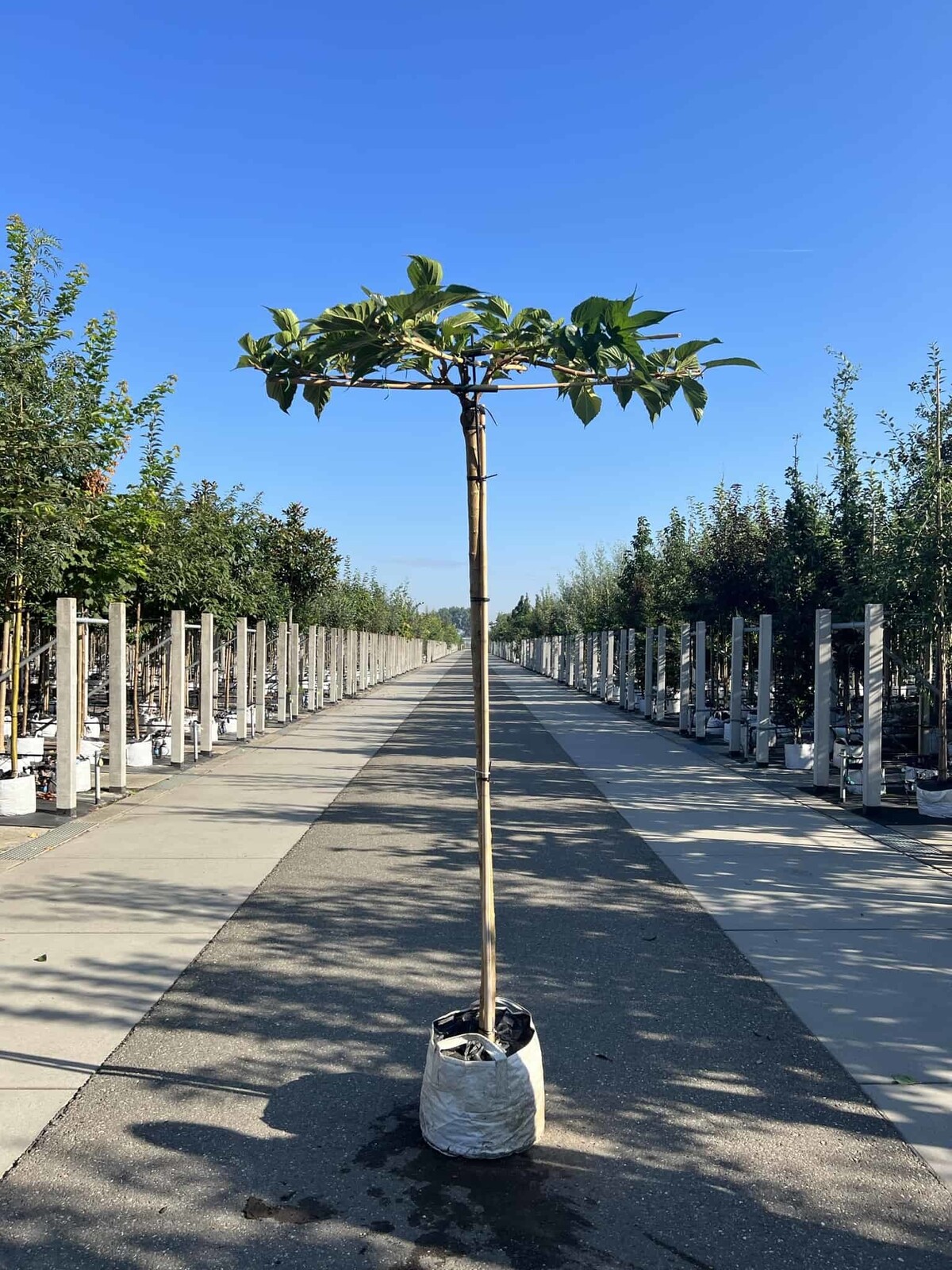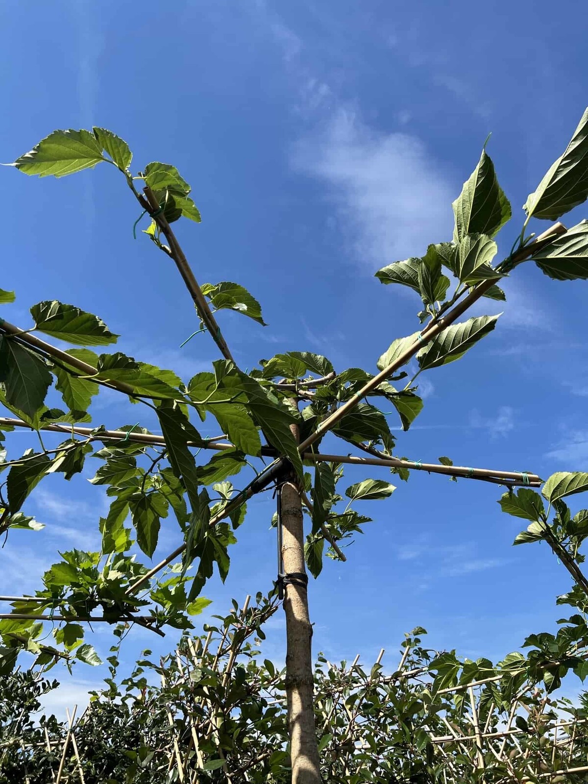 Wie hoch wird der Weißer Maulbeerbaum Fruitless Dachbaum?Der Weißer Maulbeerbaum Fruitless Dachbaum behält die Höhe, die er bei der Lieferung hat, da sein Wachstum hauptsächlich seitwärts entlang der dachförmigen Struktur erfolgt. Dies macht ihn ideal für kontrollierte Gartendesigns.