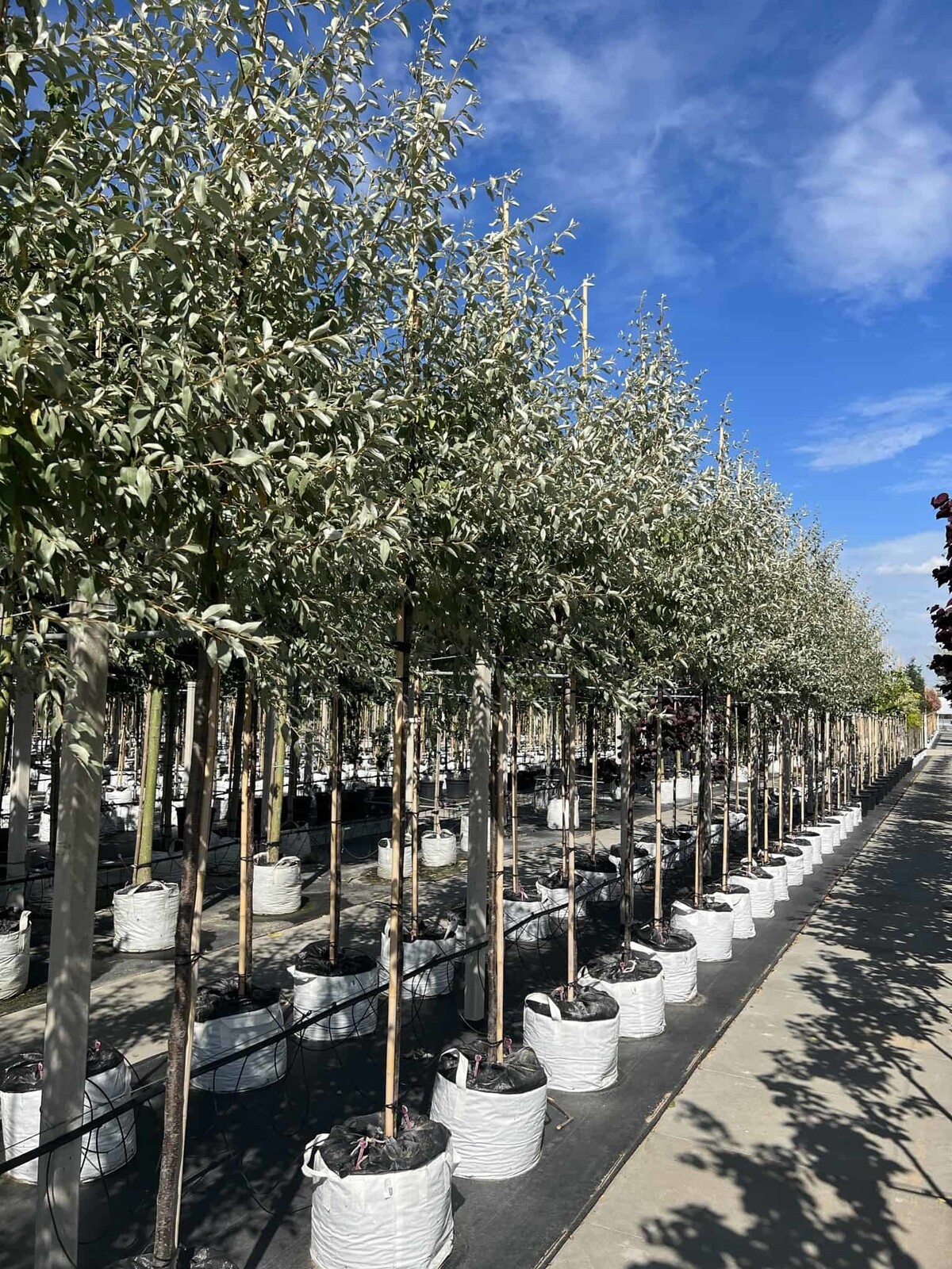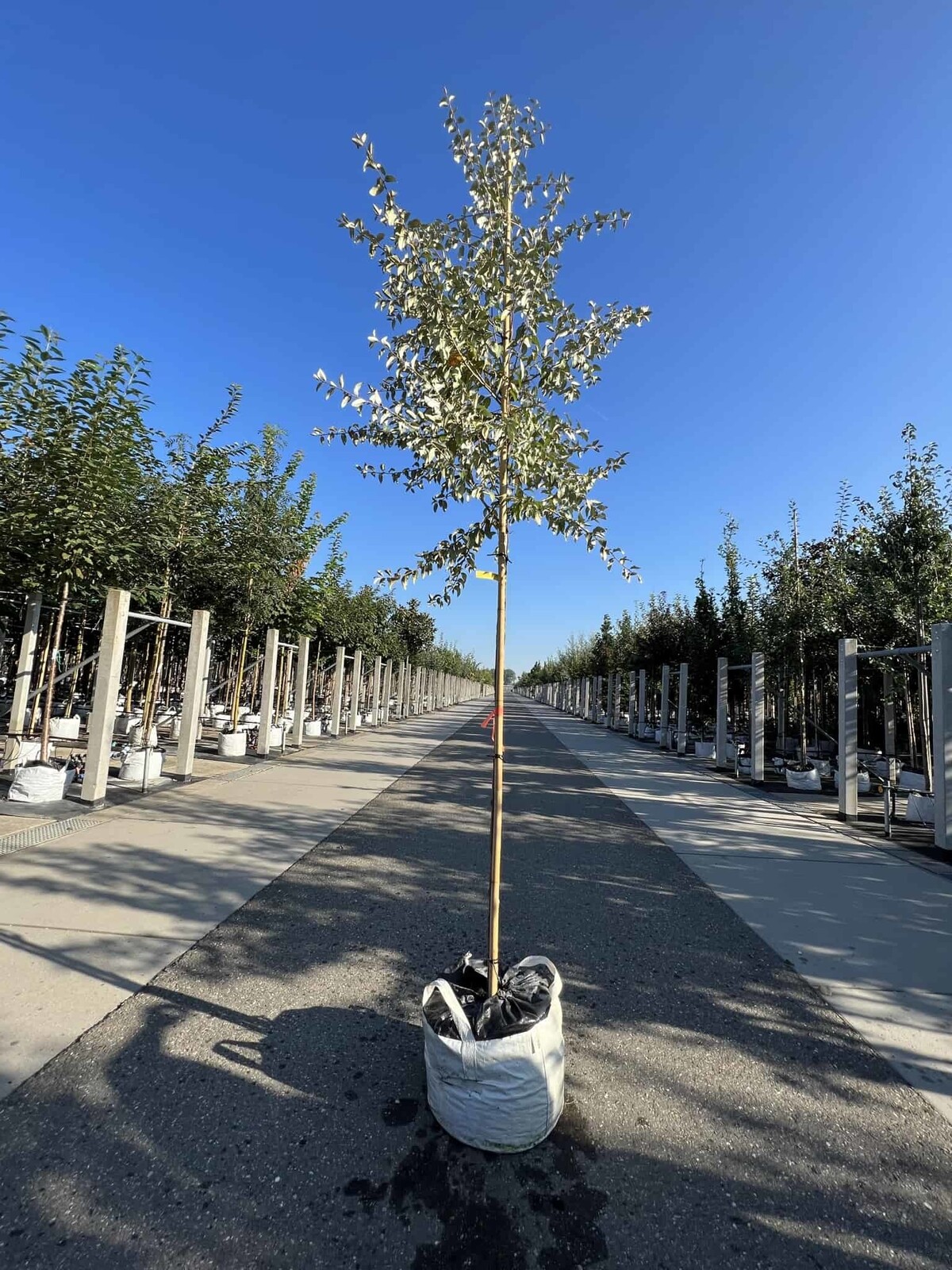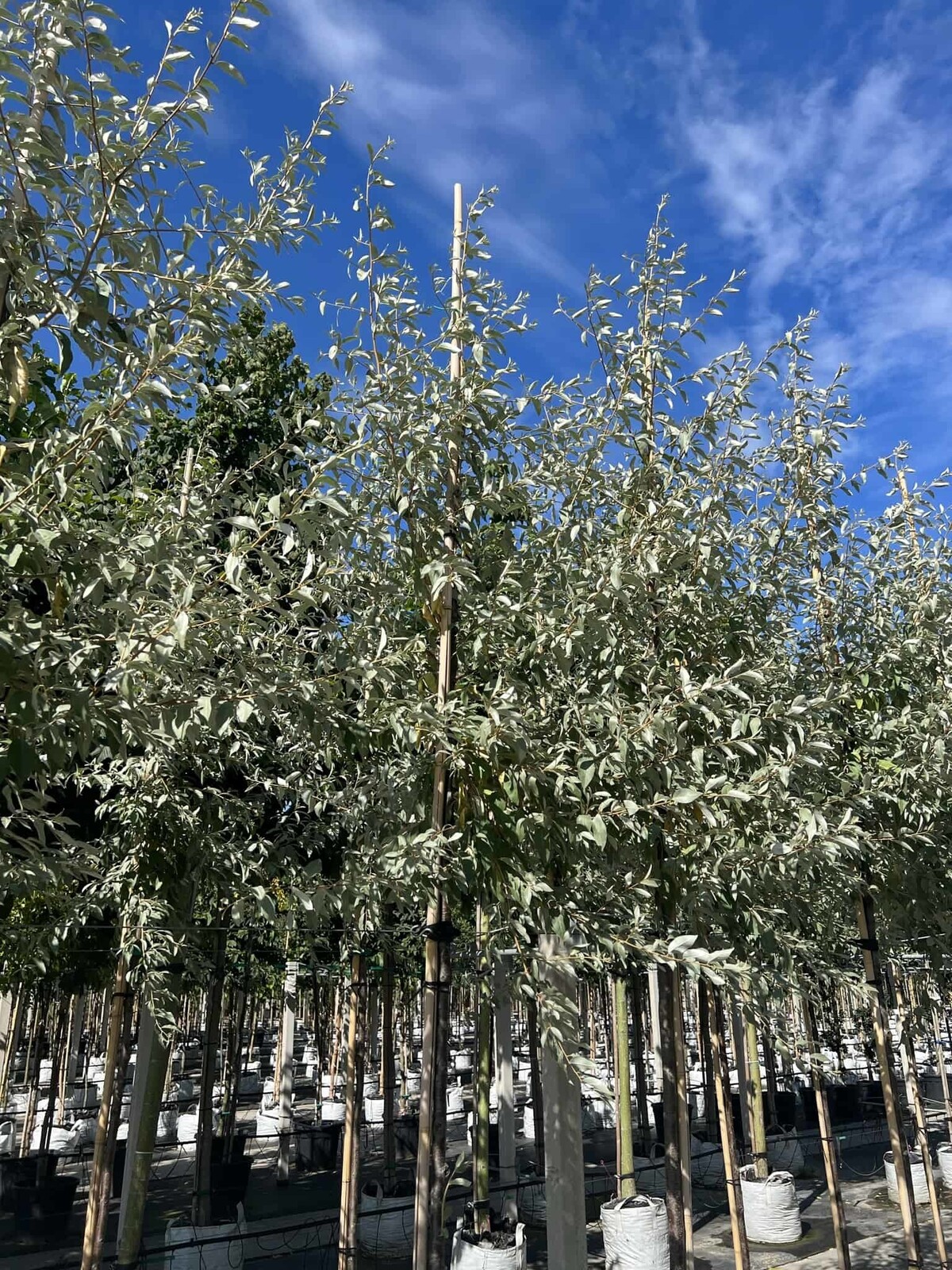 Die Blätter haben eine auffällige silbergraue Farbe, die dem Baum eine elegante und exotische Ausstrahlung verleiht. Das silbrige Laub reflektiert das Sonnenlicht auf beeindruckende Weise.