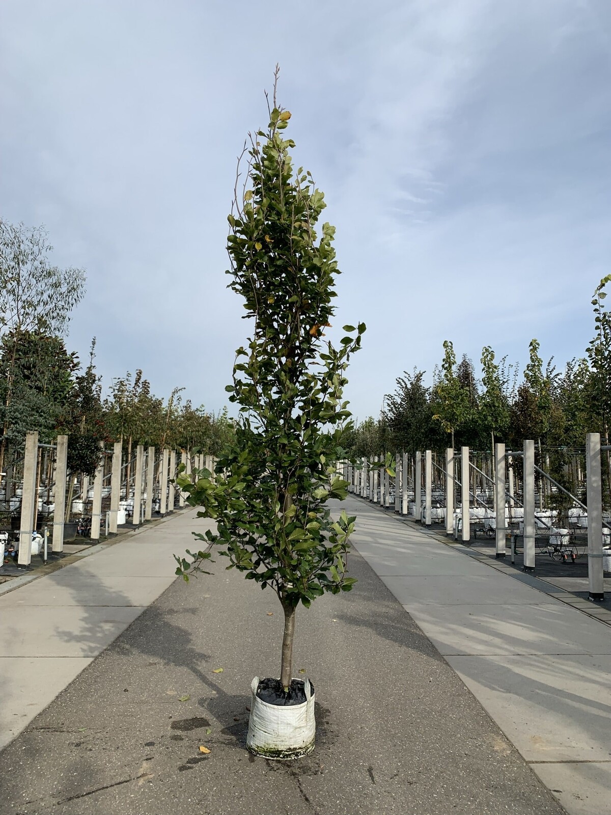 Die Orient-Buche 'Iskander' zeichnet sich durch ihre schlanke, säulenförmige Wuchsform und die geschlossene Krone aus. Sie erreicht eine Höhe von bis zu 20 Metern und hat grüne Blätter, die sich im Herbst gelb bis orangerot färben.