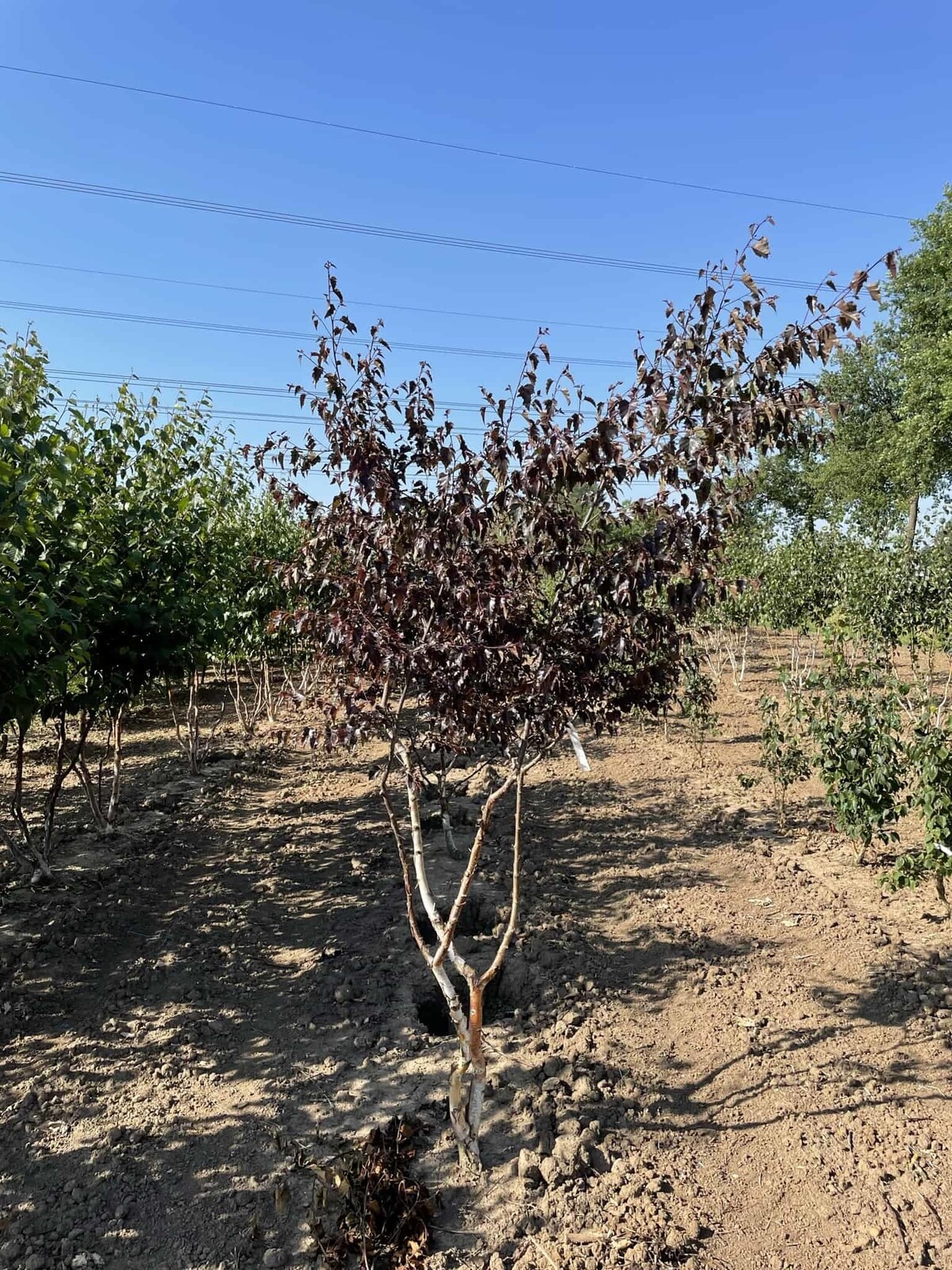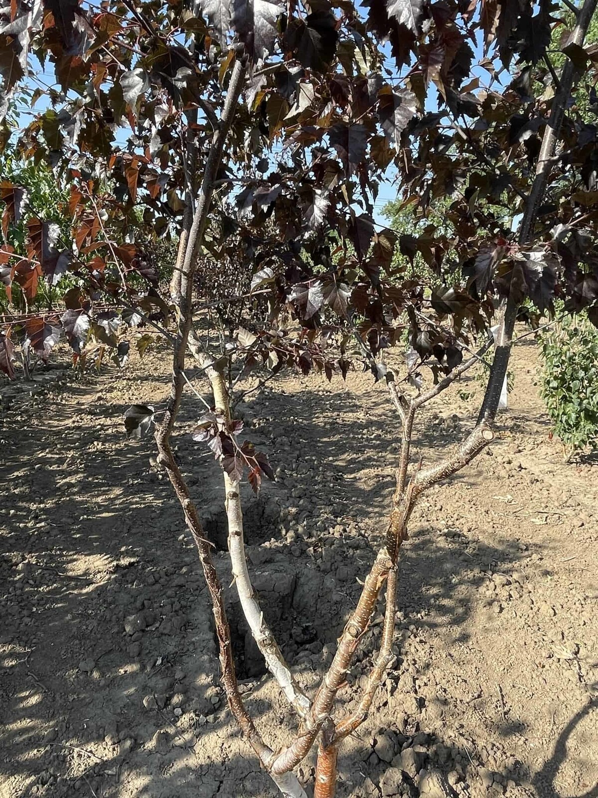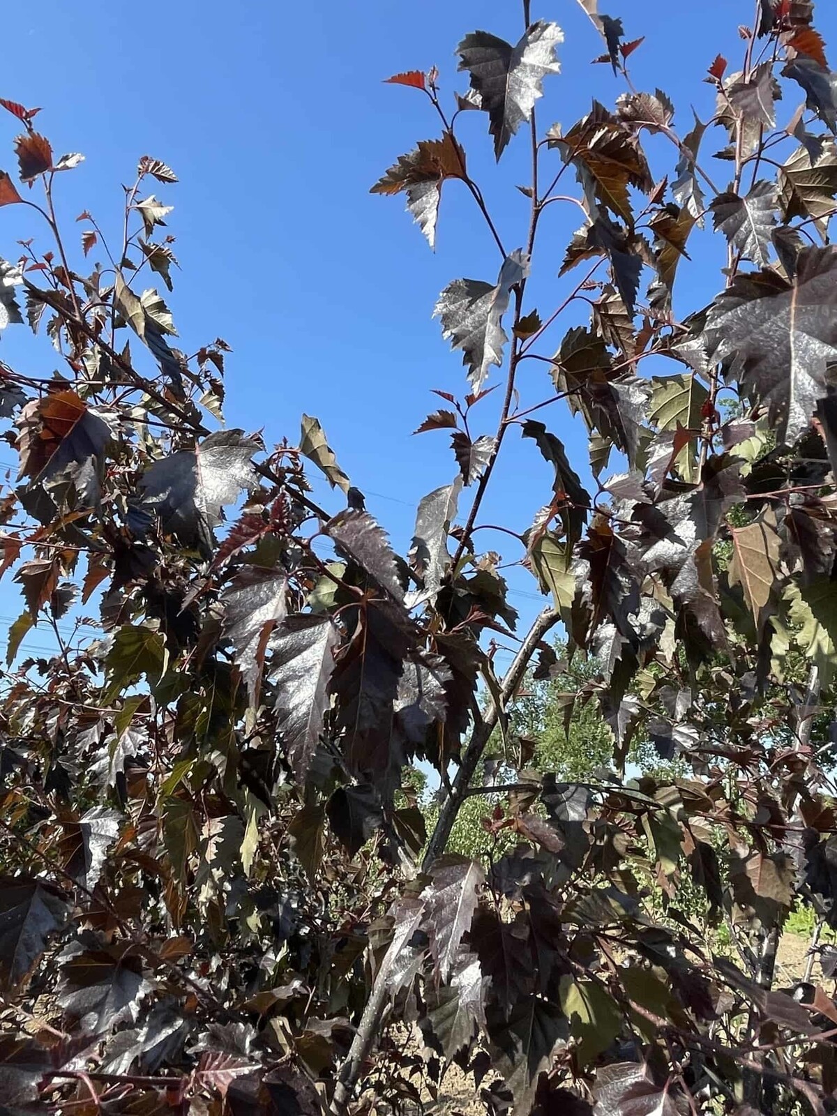 Dunkles, purpurgrünes Laub bildet ein lichtes Kronendach und spendet angenehmen, luftigen Schatten; die Mehrstamm-Form bleibt klar erkennbar.