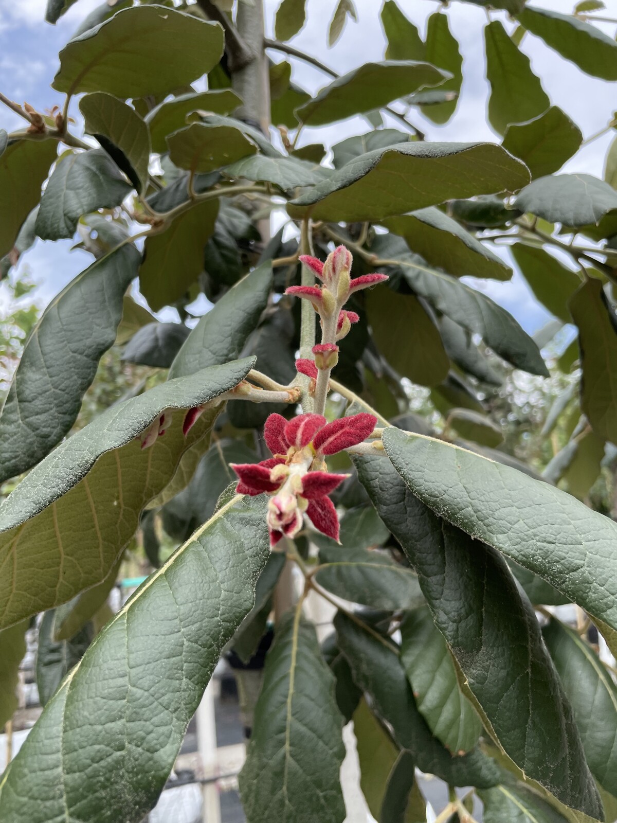 Eines der bemerkenswertesten Merkmale der Eiche ‘White House Farm’ | Quercus crassifolia ‘White House Farm’ sind ohne Zweifel ihre prächtigen roten Austriebe. Diese leuchtend roten Triebe erscheinen im Frühjahr und verleihen dem Baum einen besonders auffälligen und attraktiven Look. Die jungen Blätter, die aus diesen Austrieben hervorgehen, sind ebenfalls rot gefärbt und fügen einen Hauch von Farbe und Dramatik zur Landschaft hinzu. Während sie reifen, wechseln sie allmählich zu einem glänzenden, tiefen Grün, aber die leuchtend rote Farbe der jungen Triebe bleibt den ganzen Frühling über bestehen.