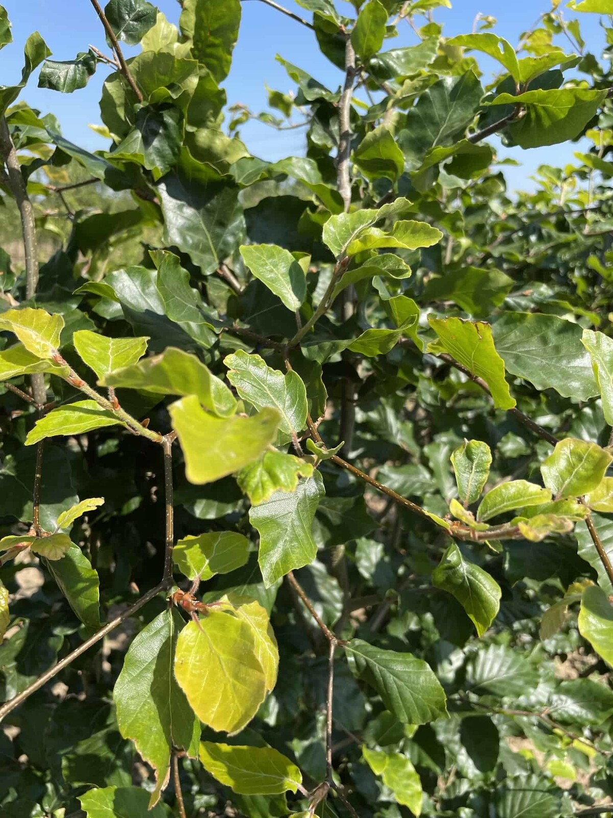 Mehrstamm-Silhouette klar lesbar; glatte Rinde und oft haftendes, kupfernes Restlaub sorgen für dezente Strukturwirkung.