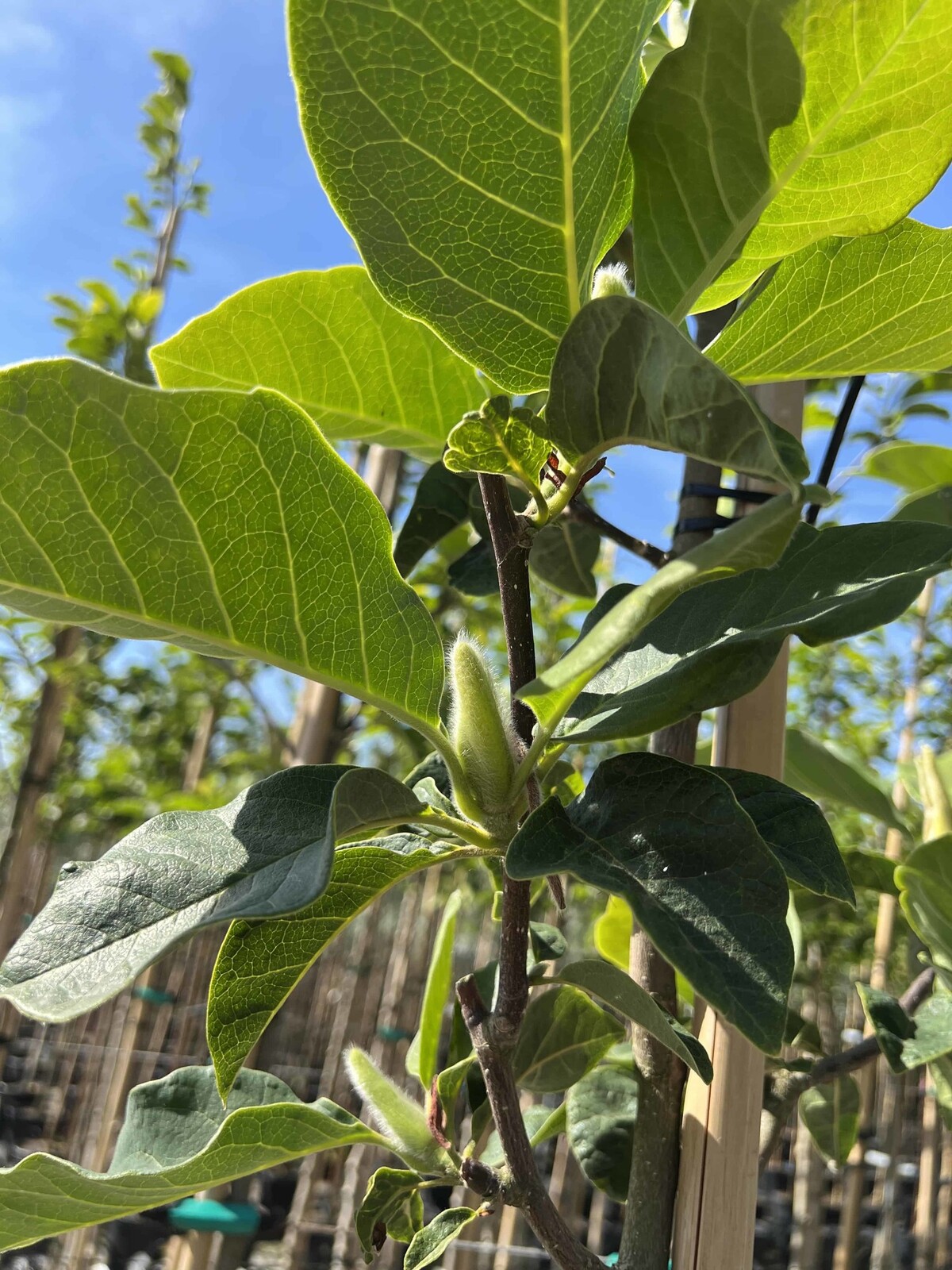 Mehrstamm-Silhouette klar erkennbar; pelzige Blütenknospen setzen dezente Akzente im laubfreien Garten.