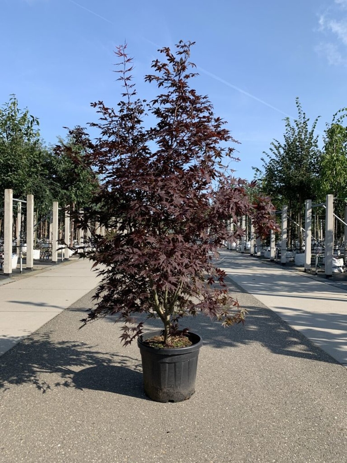 Stabile, kompakte Krone mit dauerhaft dunkelroter Blattfarbe; ein wirkungsvoller Kontrast zu grünen Begleitpflanzen.