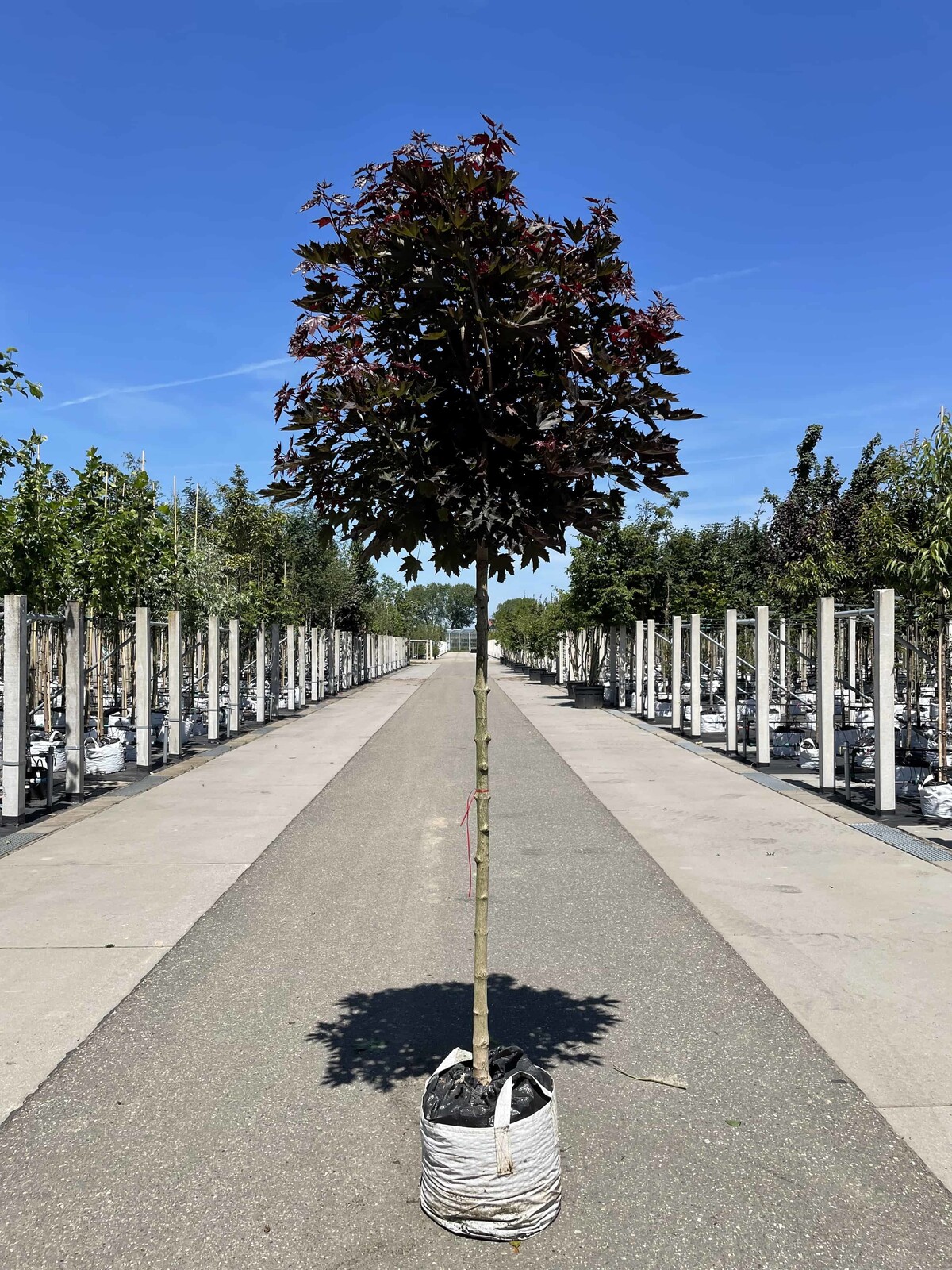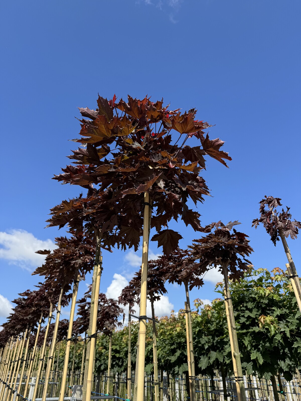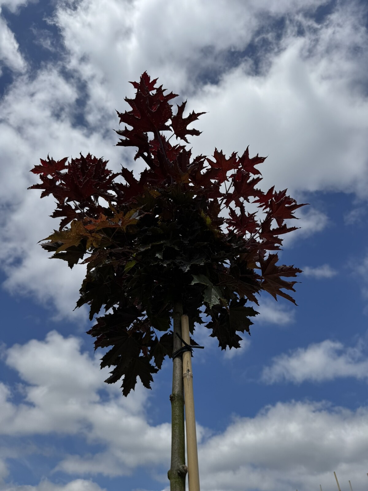 Der Rote Kugelahorn, botanisch Acer platanoides 'Crimson Sentry' genannt, hat seine Wurzeln in Europa, ist aber mittlerweile in vielen Teilen der Welt verbreitet. Dieser dekorative Baum ist eine Kultivar des Gewöhnlichen Spitzahorns und wurde wegen seiner attraktiven Farbe und Form speziell gezüchtet. Die Sorte 'Crimson Sentry' ist besonders für ihre intensiv rote Laubfarbe und resistente Natur bekannt. Ihre Geschichte ist ein Beleg für die menschliche Bewunderung der Natur und das Bestreben, unsere Umgebung durch Pflanzenverschönerung zu bereichern.Roter Kugelahorn als Hochstamm: Eleganz und Stil in Perfektion