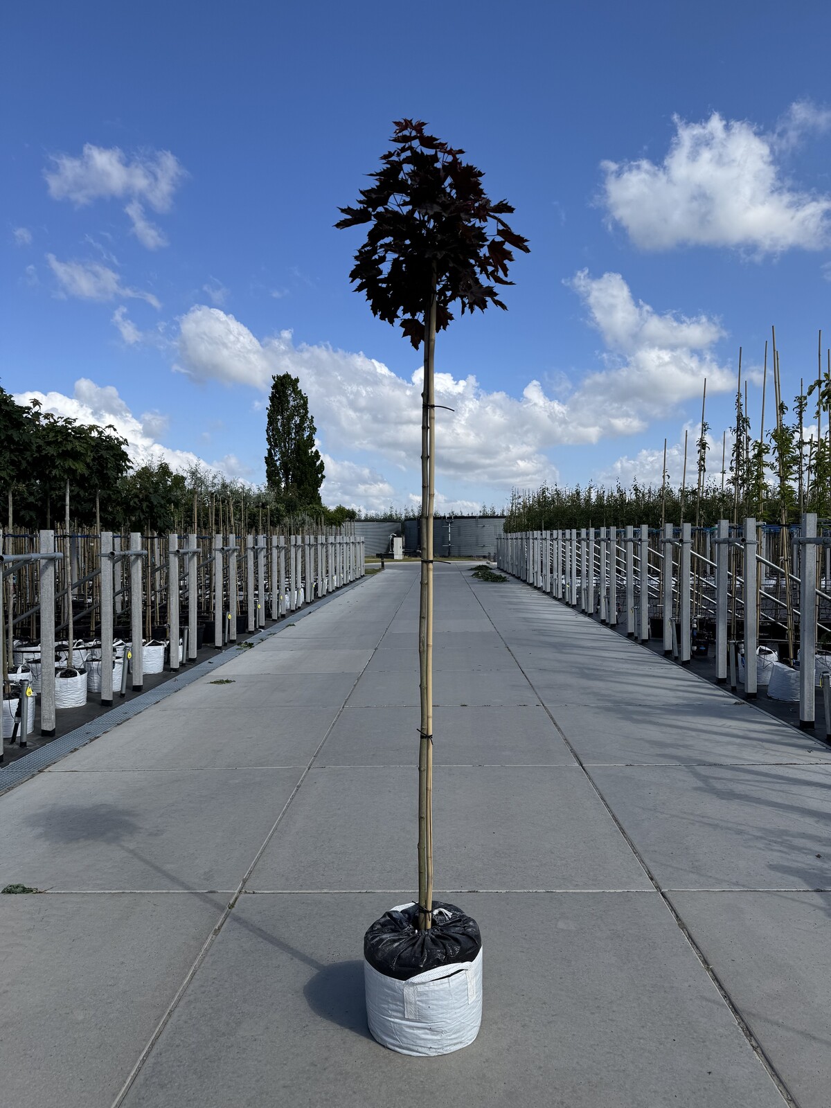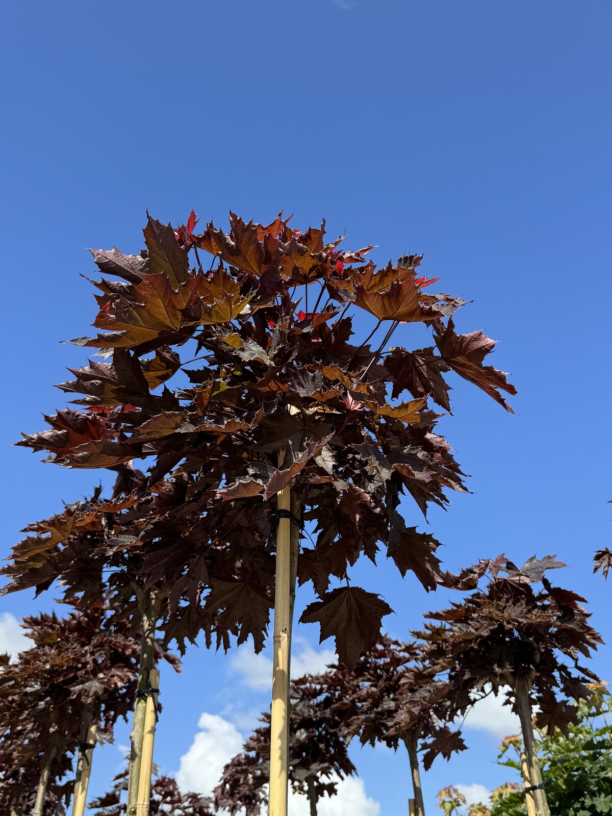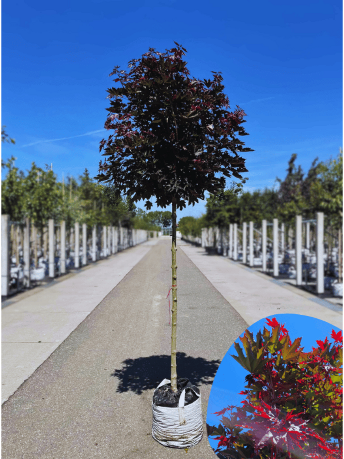 Der Rote Kugelahorn, botanisch Acer platanoides 'Crimson Sentry' genannt, hat seine Wurzeln in Europa, ist aber mittlerweile in vielen Teilen der Welt verbreitet. Dieser dekorative Baum ist eine Kultivar des Gewöhnlichen Spitzahorns und wurde wegen seiner attraktiven Farbe und Form speziell gezüchtet. Die Sorte 'Crimson Sentry' ist besonders für ihre intensiv rote Laubfarbe und resistente Natur bekannt. Ihre Geschichte ist ein Beleg für die menschliche Bewunderung der Natur und das Bestreben, unsere Umgebung durch Pflanzenverschönerung zu bereichern.Roter Kugelahorn als Hochstamm: Eleganz und Stil in Perfektion