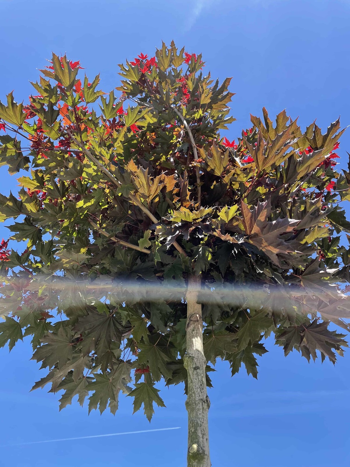Der Rote Kugelahorn ist bekannt für seine leuchtend roten Blätter, die sich im Herbst in ein noch intensiveres Rot verwandeln. Diese Baumart wächst relativ schnell und bietet eine rundliche, dichte Krone, die Schatten und visuelles Interesse bietet. Der Baum erreicht typischerweise eine Höhe von 3 bis 5 Metern und bevorzugt gut durchlässige Böden sowie einen Standort in voller Sonne bis Halbschatten. Die kleinen, attraktiven Blüten des Roten Kugelahorns sind ebenfalls ein Bonus, die im Frühjahr erscheinen.Herkunft und Geschichte des Roten Kugelahorns: Eine Reise durch die Zeit