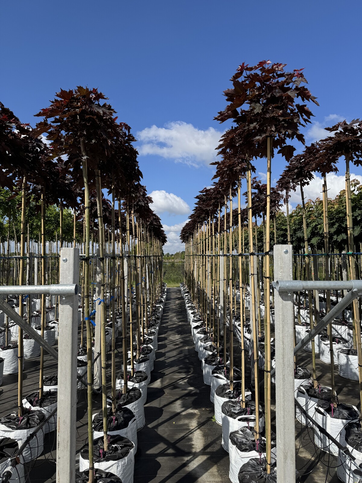 Als Hochstamm wächst der Rote Kugelahorn mit einem klaren, geraden Stamm, der in eine perfekte, kugelförmige Krone mündet. Diese Wuchsform verleiht dem Baum eine formelle Eleganz, die ihn ideal für Alleen, formale Gärten oder als markantes Solitärelement macht. Seine gleichmäßige Form erfordert minimalen Schnitt und bietet eine konstante, zuverlässige Schönheit über die Jahreszeiten hinweg.Pflege des Roten Kugelahorns: So bleibt Ihr Baum gesund und stark