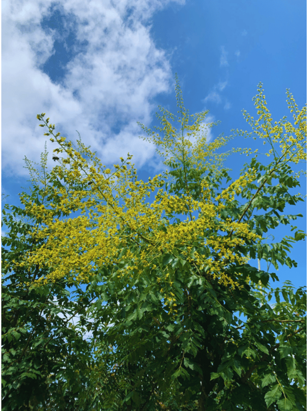 Der Sommer ist die Blütezeit des Koelreuteria paniculata 'Fastigiata'. Seine gelben Blüten bilden einen auffälligen Kontrast zum grünen Laub und ziehen zahlreiche Insekten an.