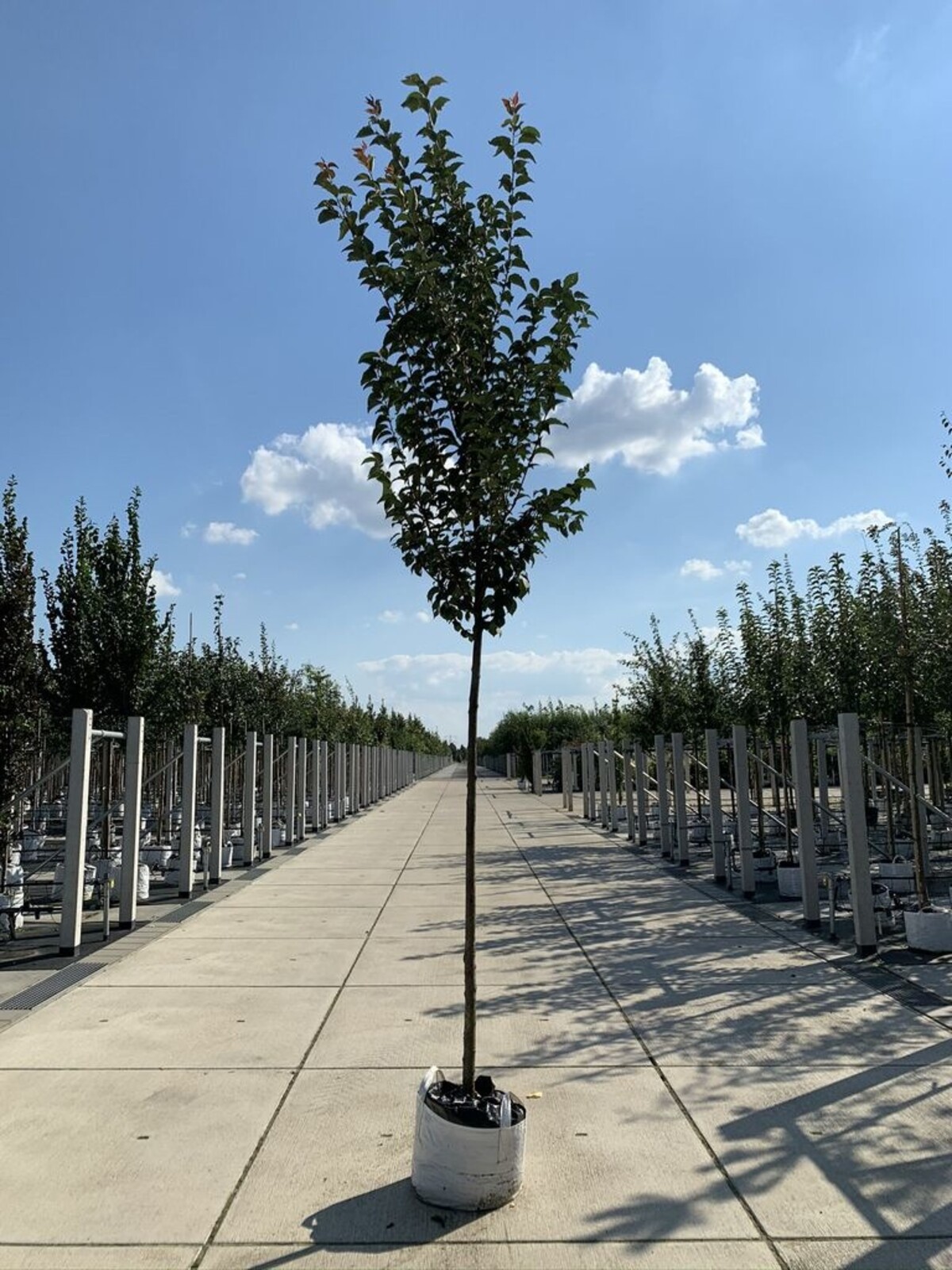 Die Säulenkirsche 'Spire' wächst schnell und benötigt gut durchlässigen Boden sowie einen sonnigen bis halbschattigen Standort. Regelmäßige Bewässerung fördert das Wachstum und die Gesundheit des Baums.