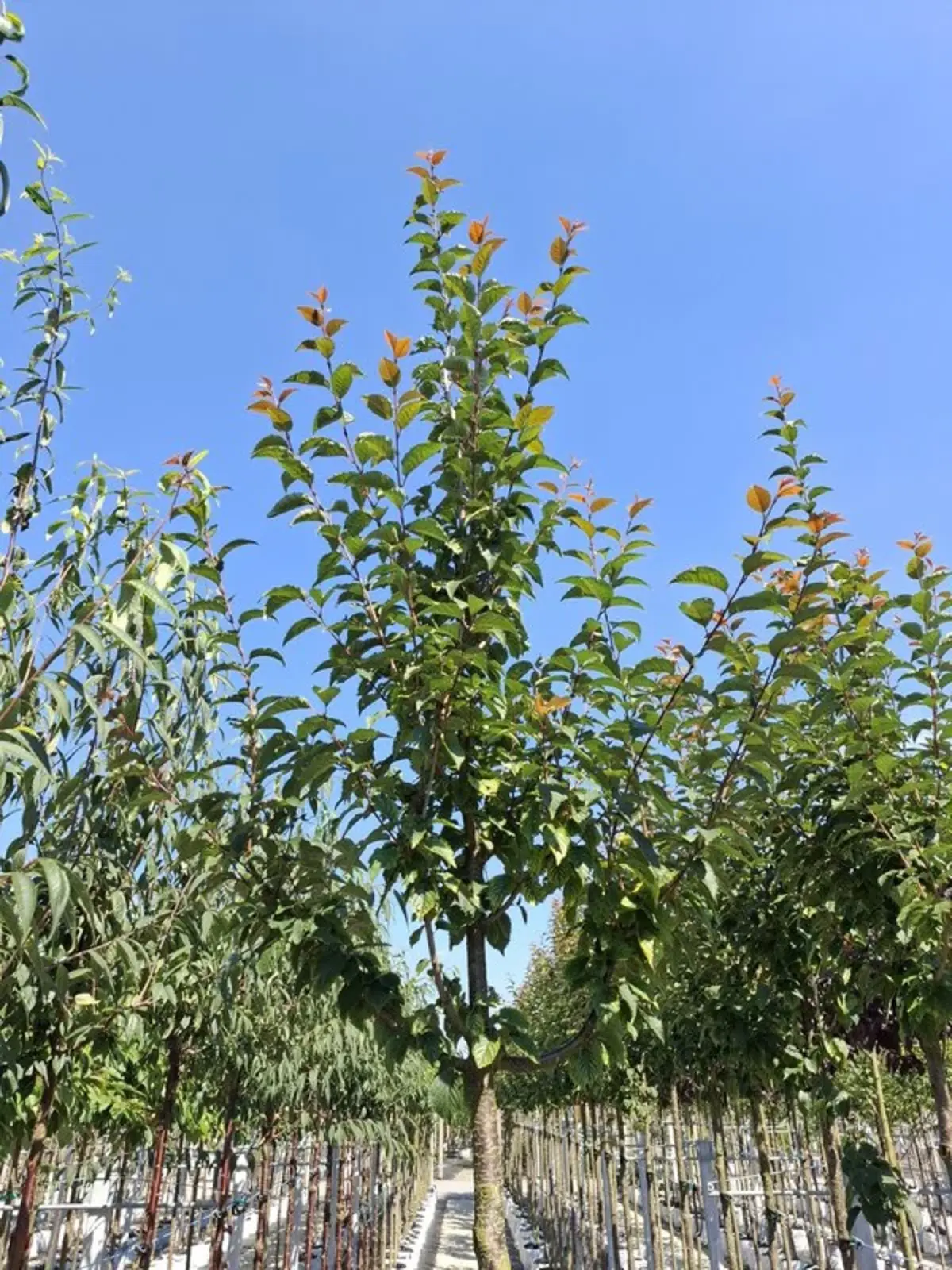 Dieser Baum wächst schlank und trichterförmig, was ihn ideal für kleine Gärten oder enge Räume macht. Die Blätter sind eirund mit gesägten Rändern und verfärben sich im Herbst in spektakulären Gelb- bis Feuerröttönen.