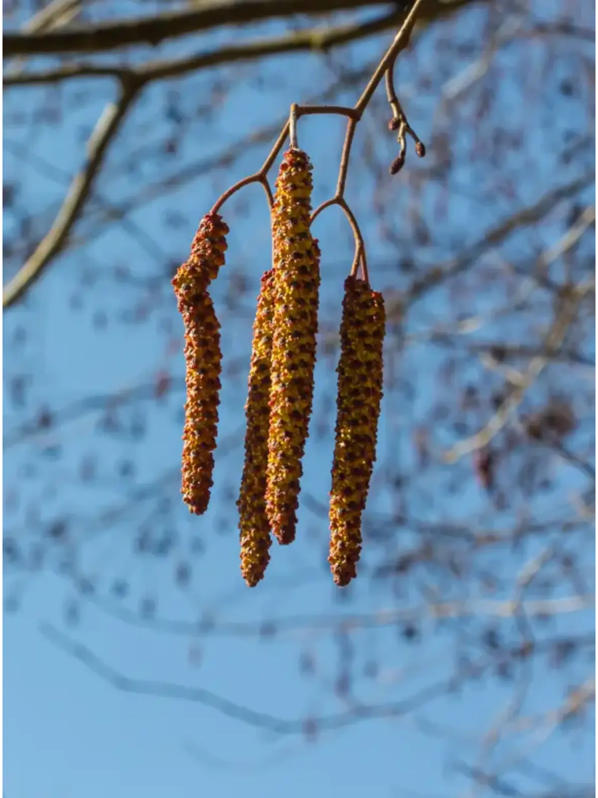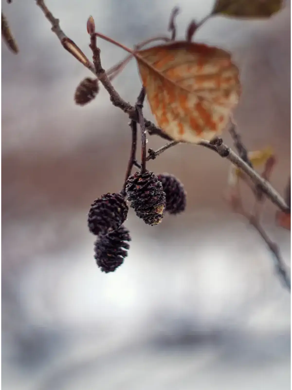 Im Winter zeigt die Schwarzerle ihr charakteristisches Aussehen mit den verbleibenden Zapfen und der markanten Rinde.