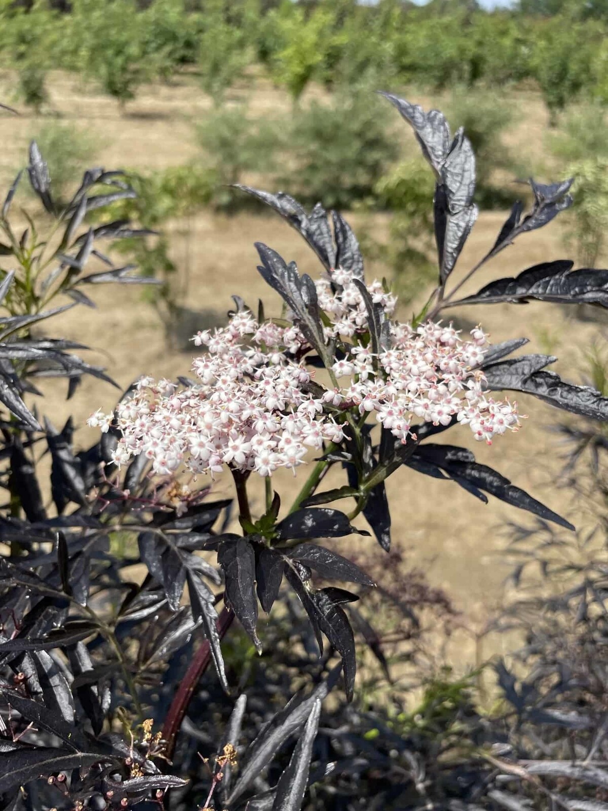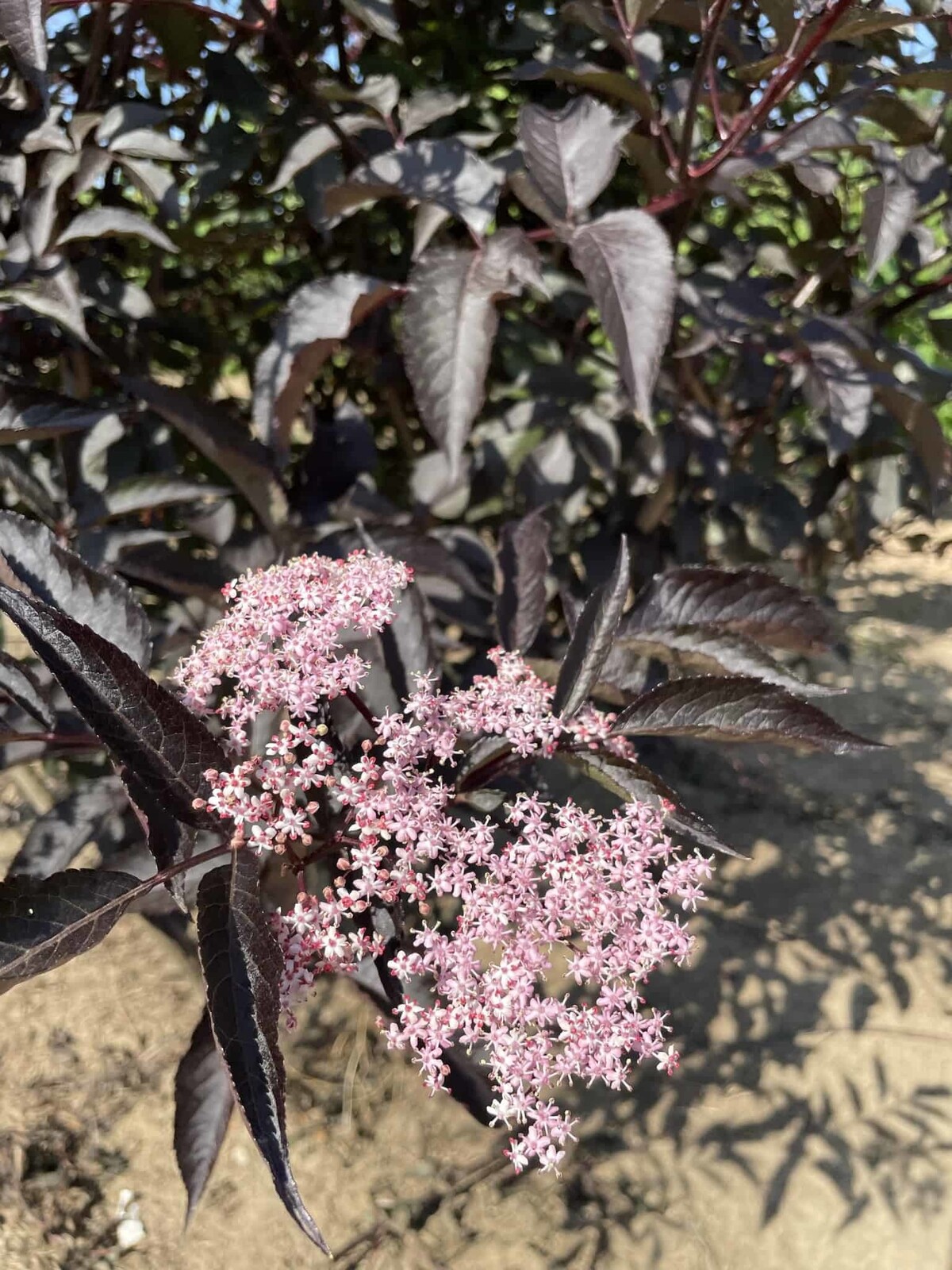 Mit schwarzem Laub, rosiger Blüte und dekorativen Beeren setzt 'Black Lace' in Mehrstamm-Erziehung edle Akzente – als Solitär, im Beet oder im Hof.