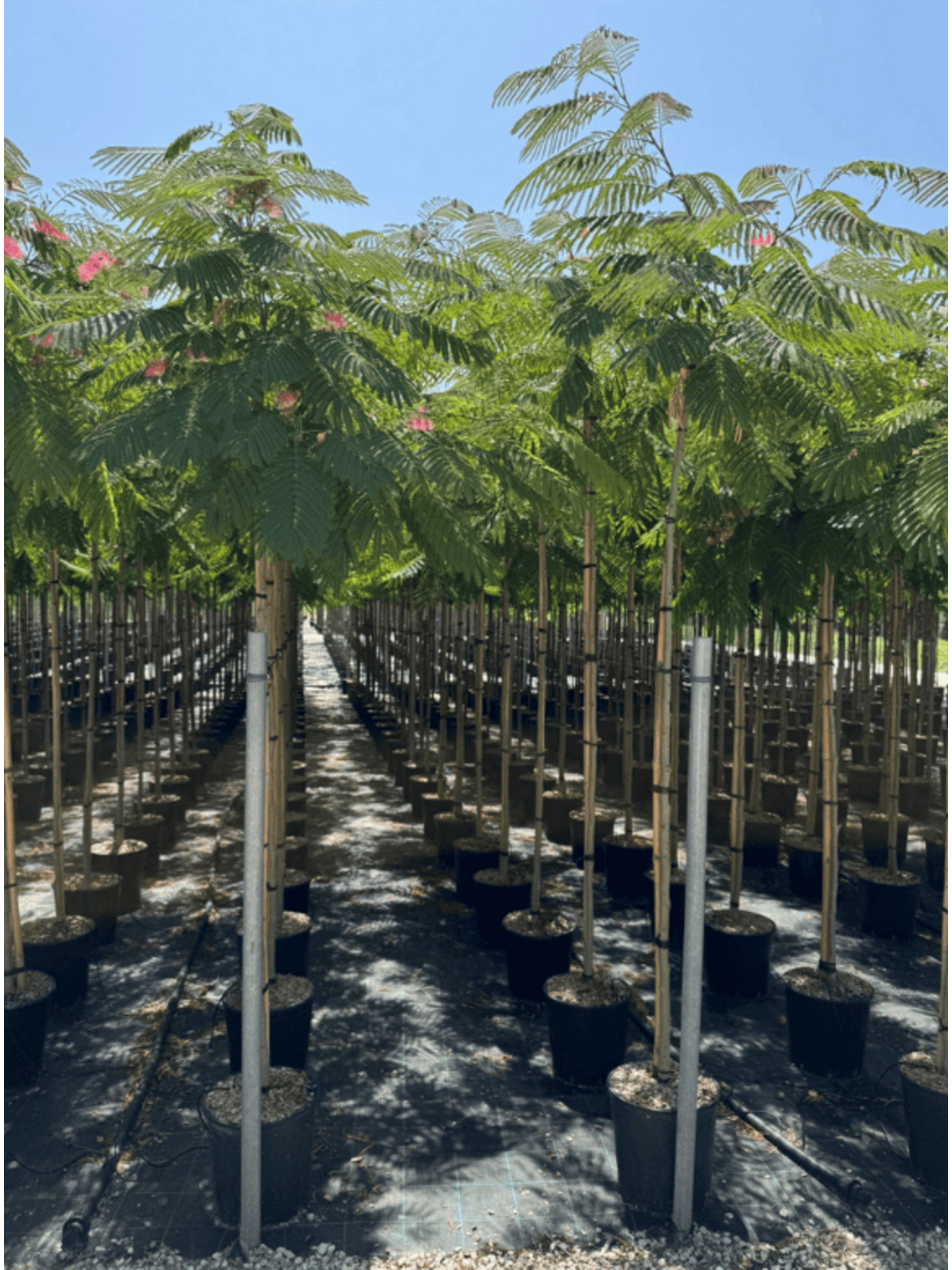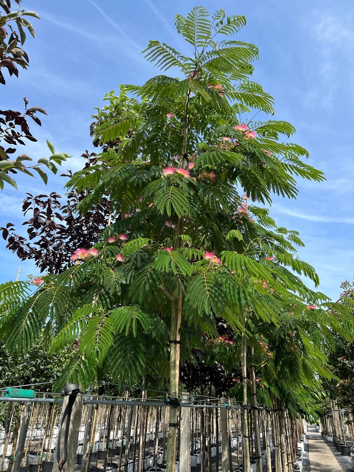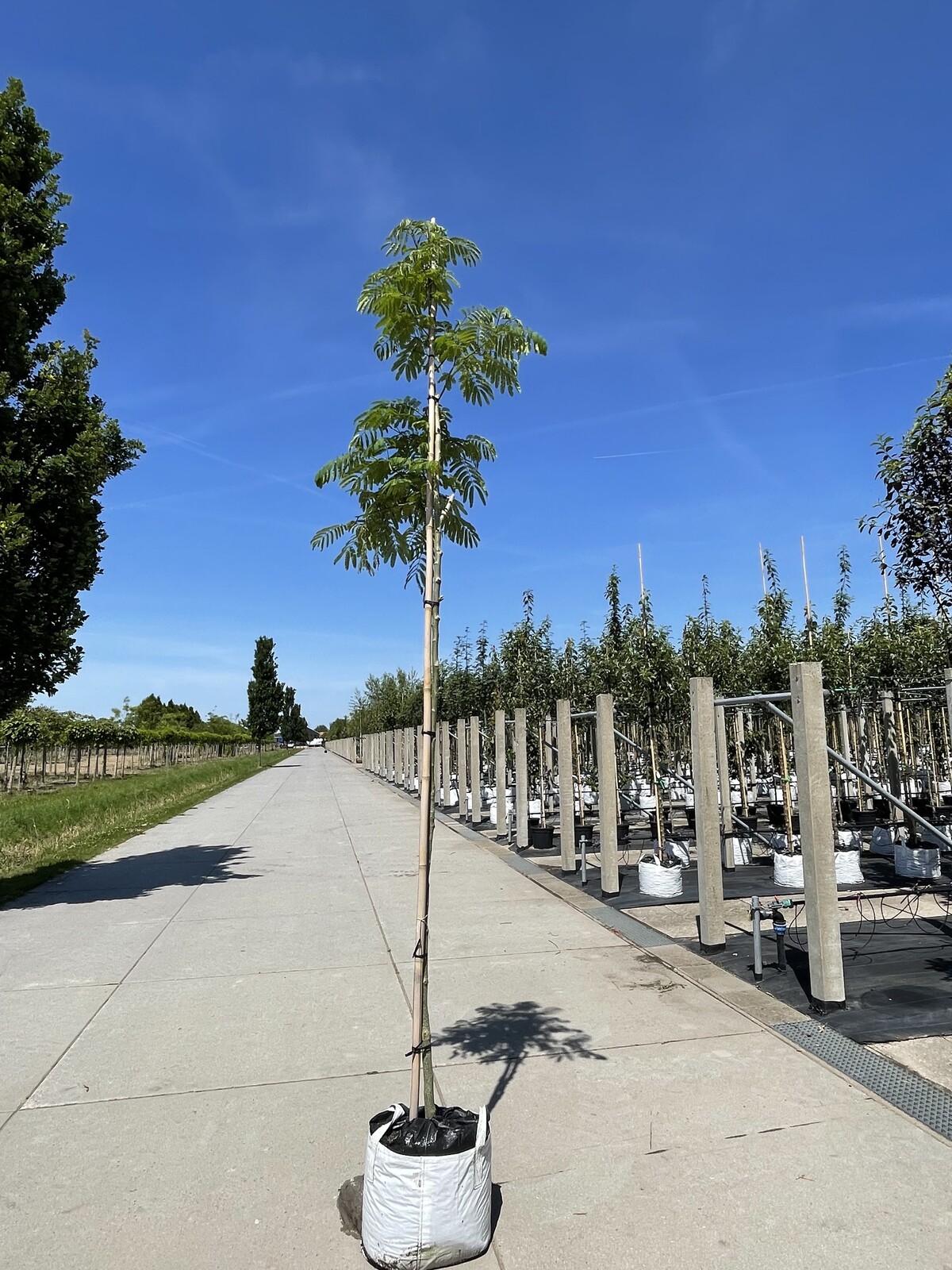 Albizia julibrissin 'Ombrella' wächst zügig und erreicht Höhen von bis zu 6 Metern. Ein sonniger, geschützter Standort mit durchlässigem Boden ist ideal. In den ersten Jahren nach dem Pflanzen lohnt sich ein regelmäßiger Formschnitt, um eine ausgewogene und kompakte Krone zu fördern.