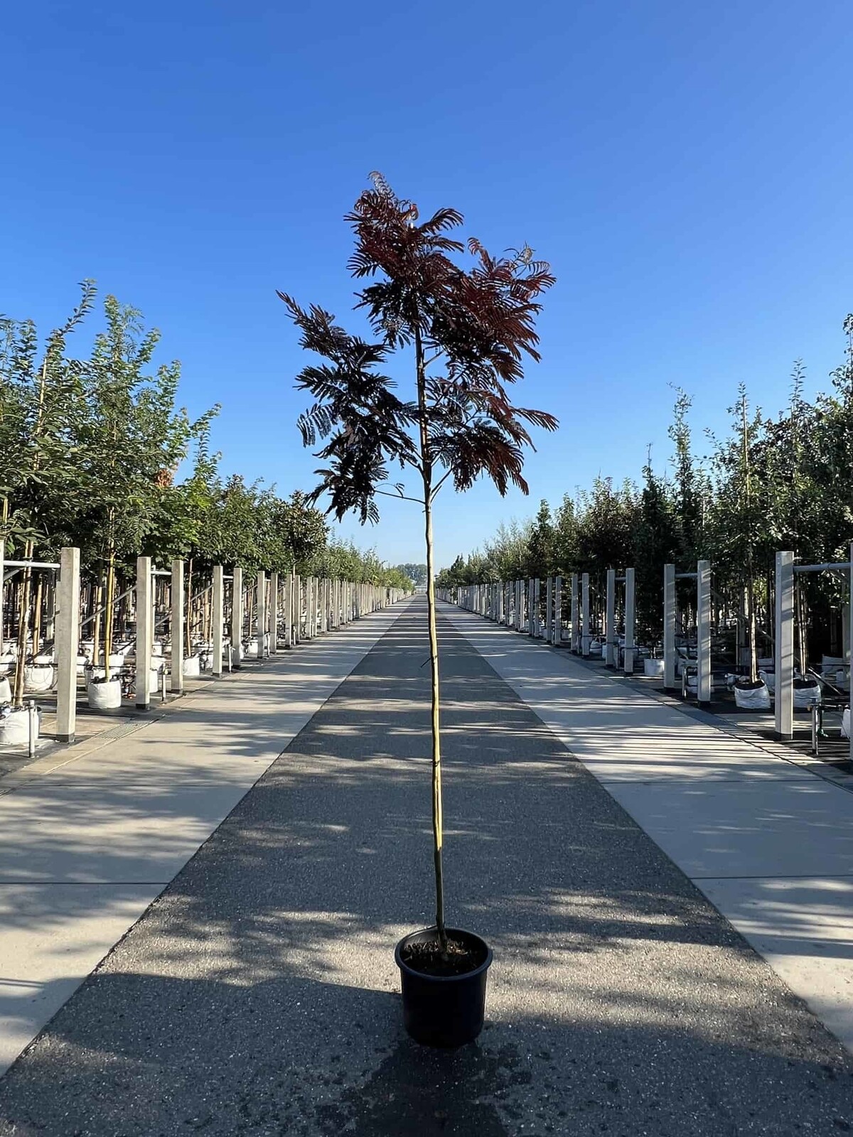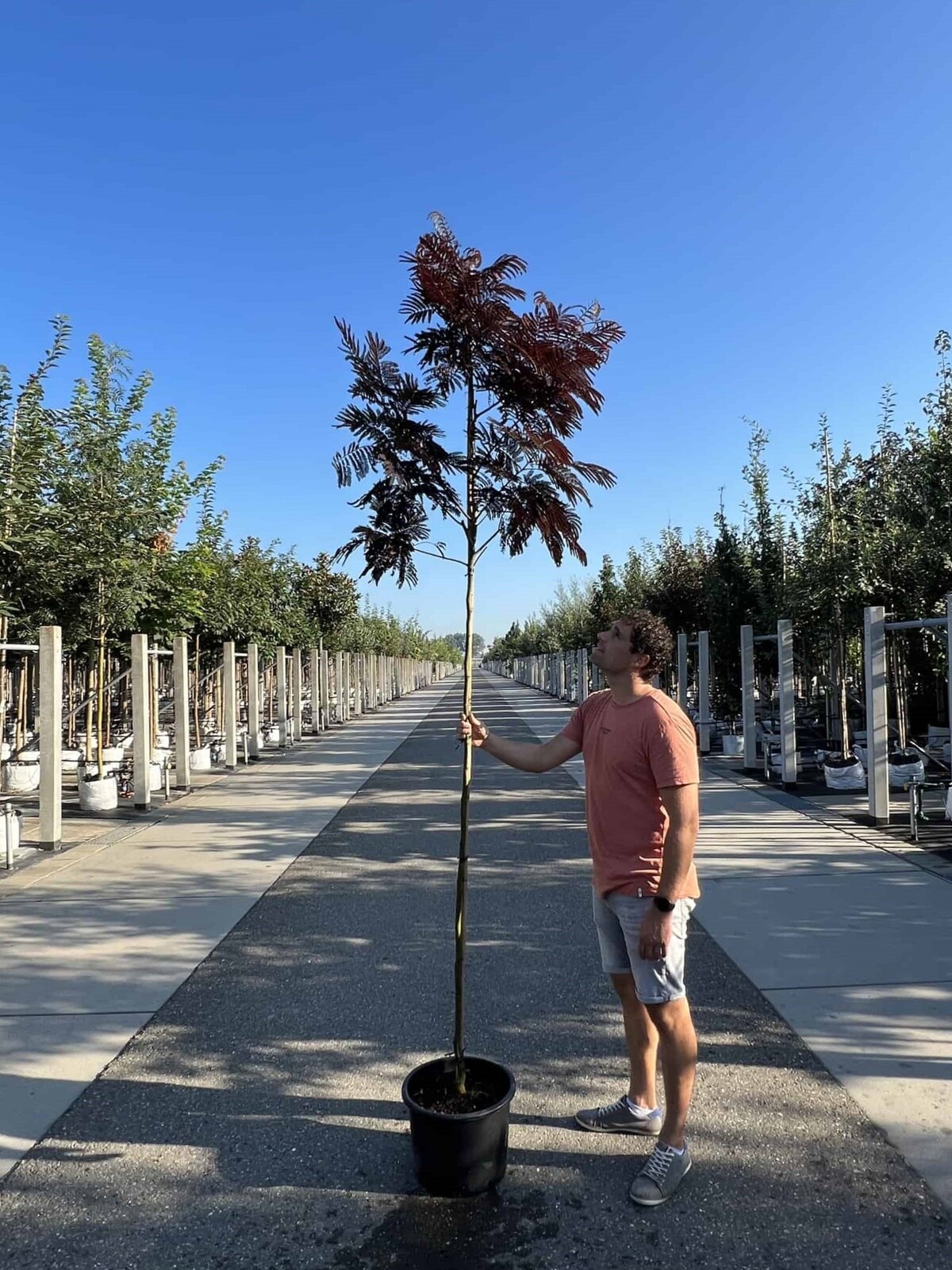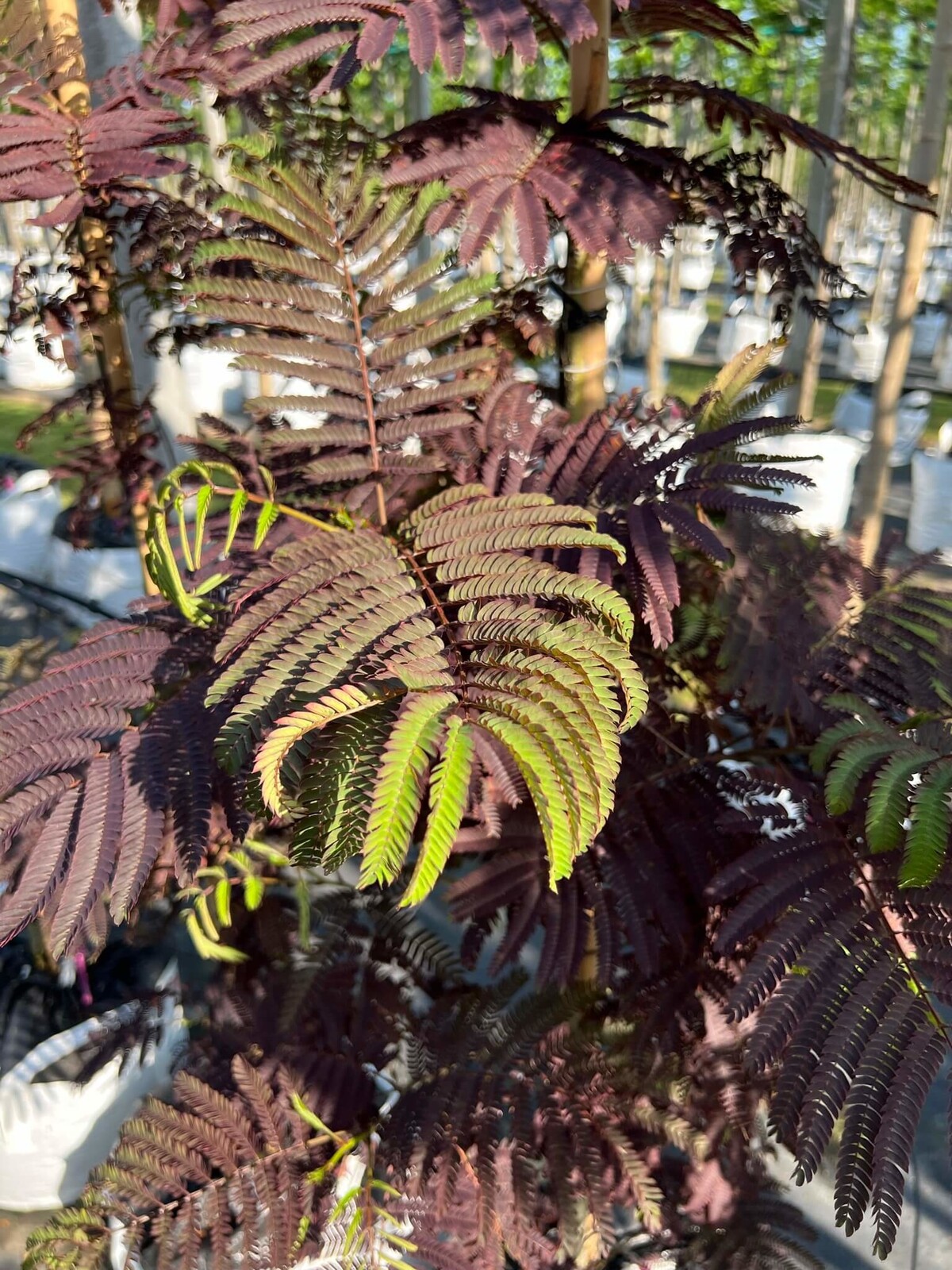 Der Seidenbaum 'Summer Chocolate' wächst zu einem mittelgroßen Baum heran, der eine Höhe von etwa 6 bis 10 Metern erreichen kann. Er bevorzugt sonnige Standorte und gut durchlässigen Boden. Sein Wuchs ist breit ausladend und locker, was ihm ein luftiges und leichtes Erscheinungsbild verleiht.