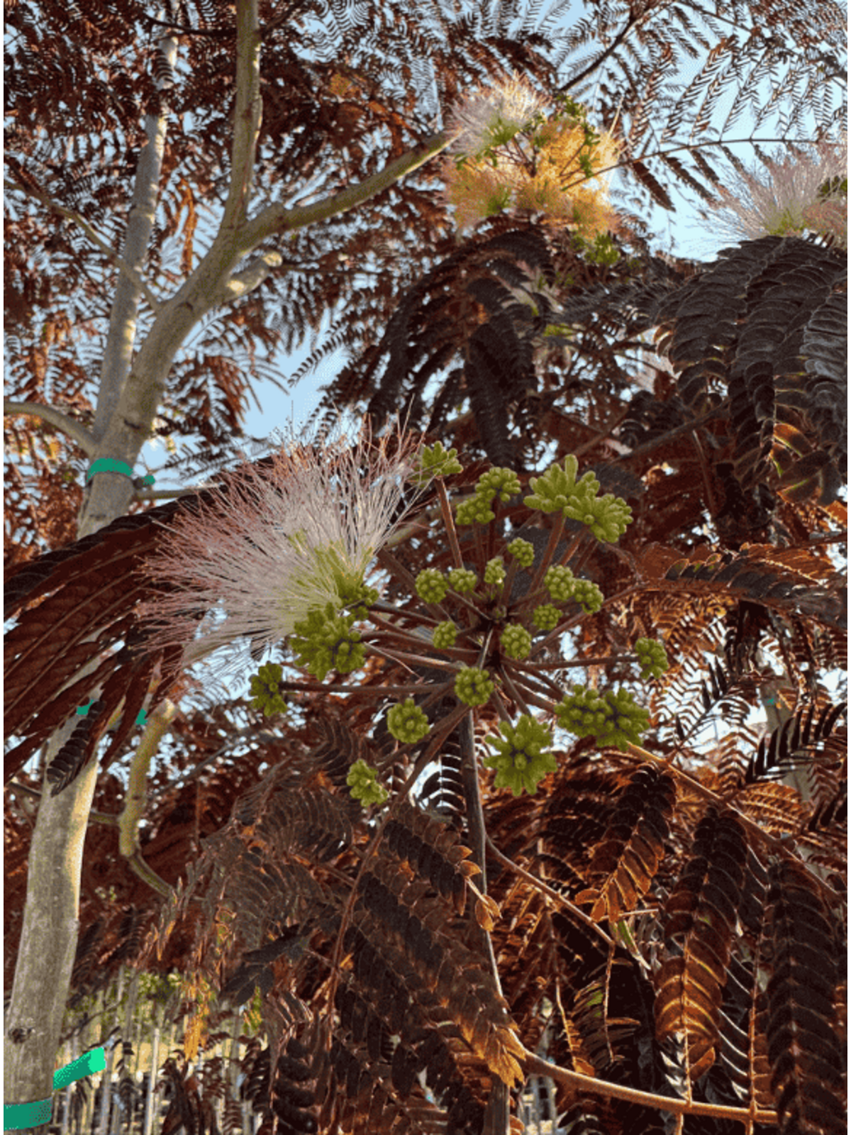 Wann blüht der Seidenbaum 'Summer Chocolate'?Die Blüten erscheinen im Hochsommer und bieten ein wunderschönes Farbenspiel.